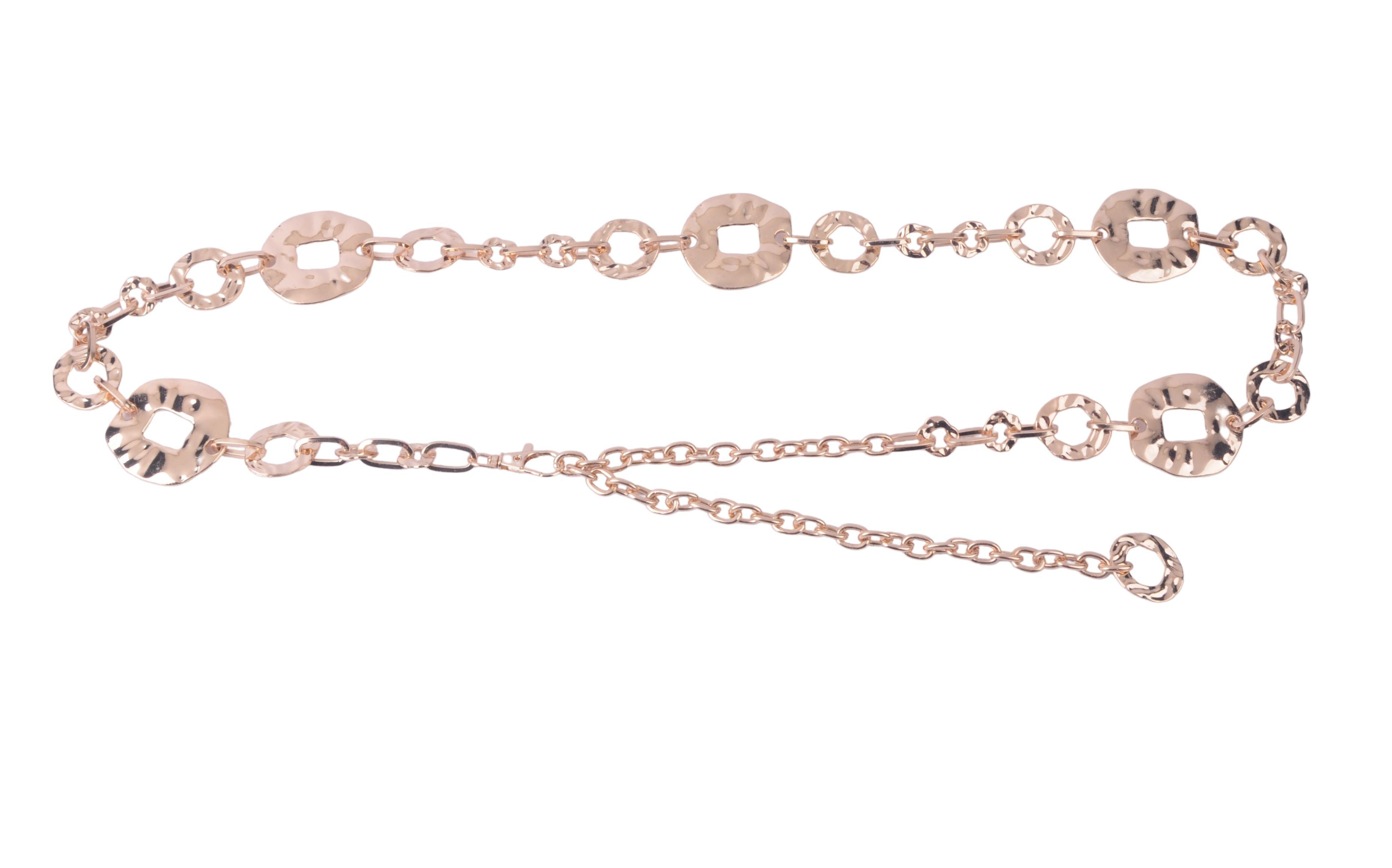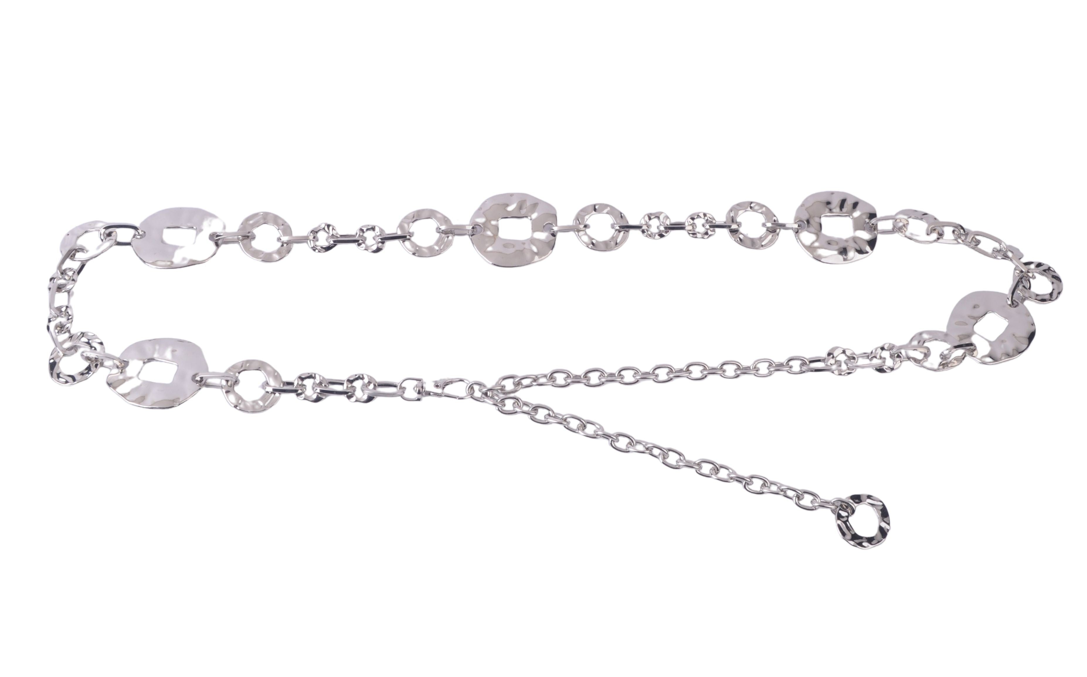 Add bold, Y2K-inspired flair to any outfit with this metallic donut link belt. Crafted from a series of interlocking, donut-shaped metal links, this belt is both functional and fashion-forward. Its eye-catching, open-link design makes it the perfect accessory for low-waisted jeans, skirts, or layering over dresses and oversized tees.