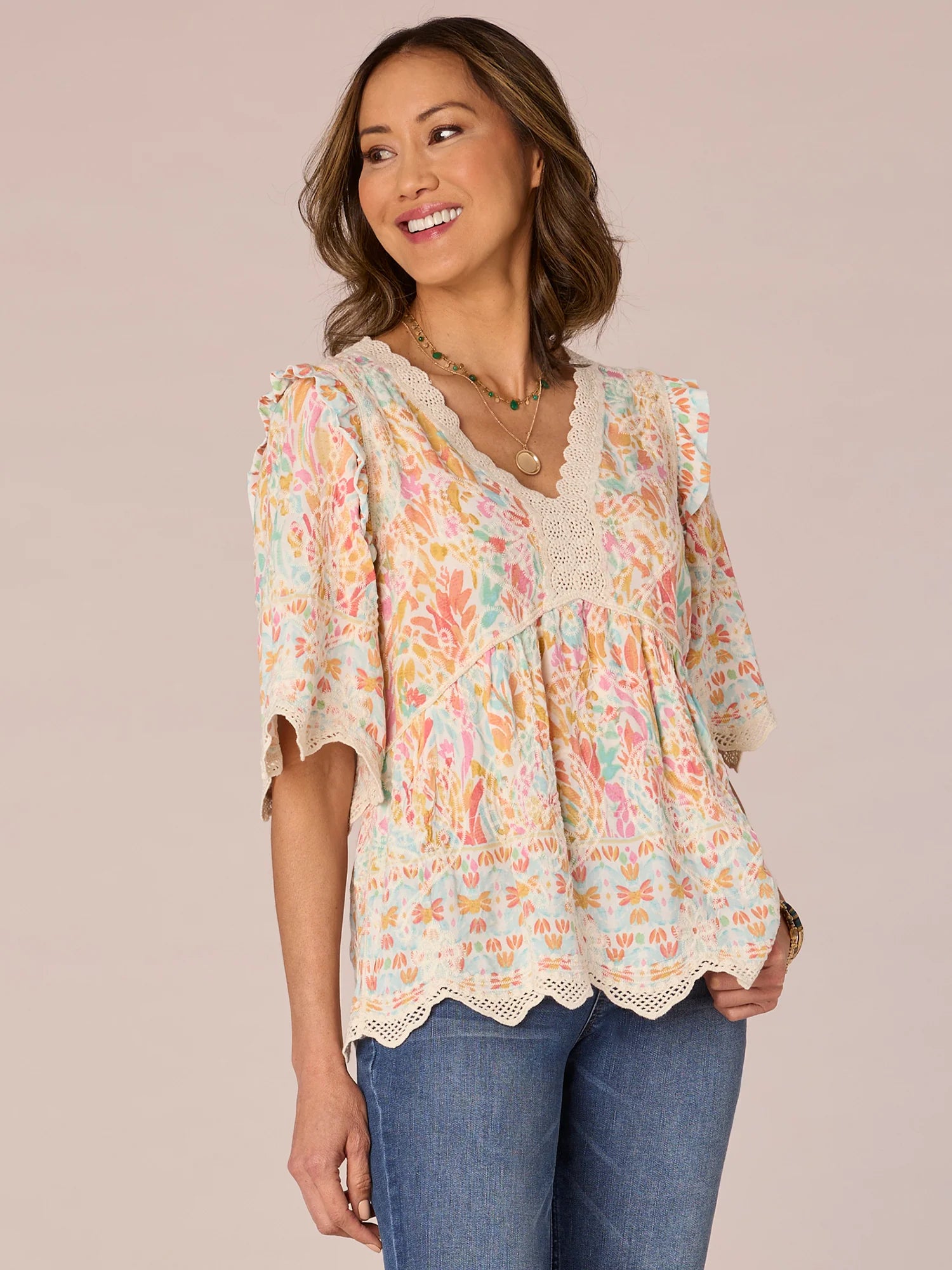3/4 Blouson Sleeve w/ Crochet Insert Yoke