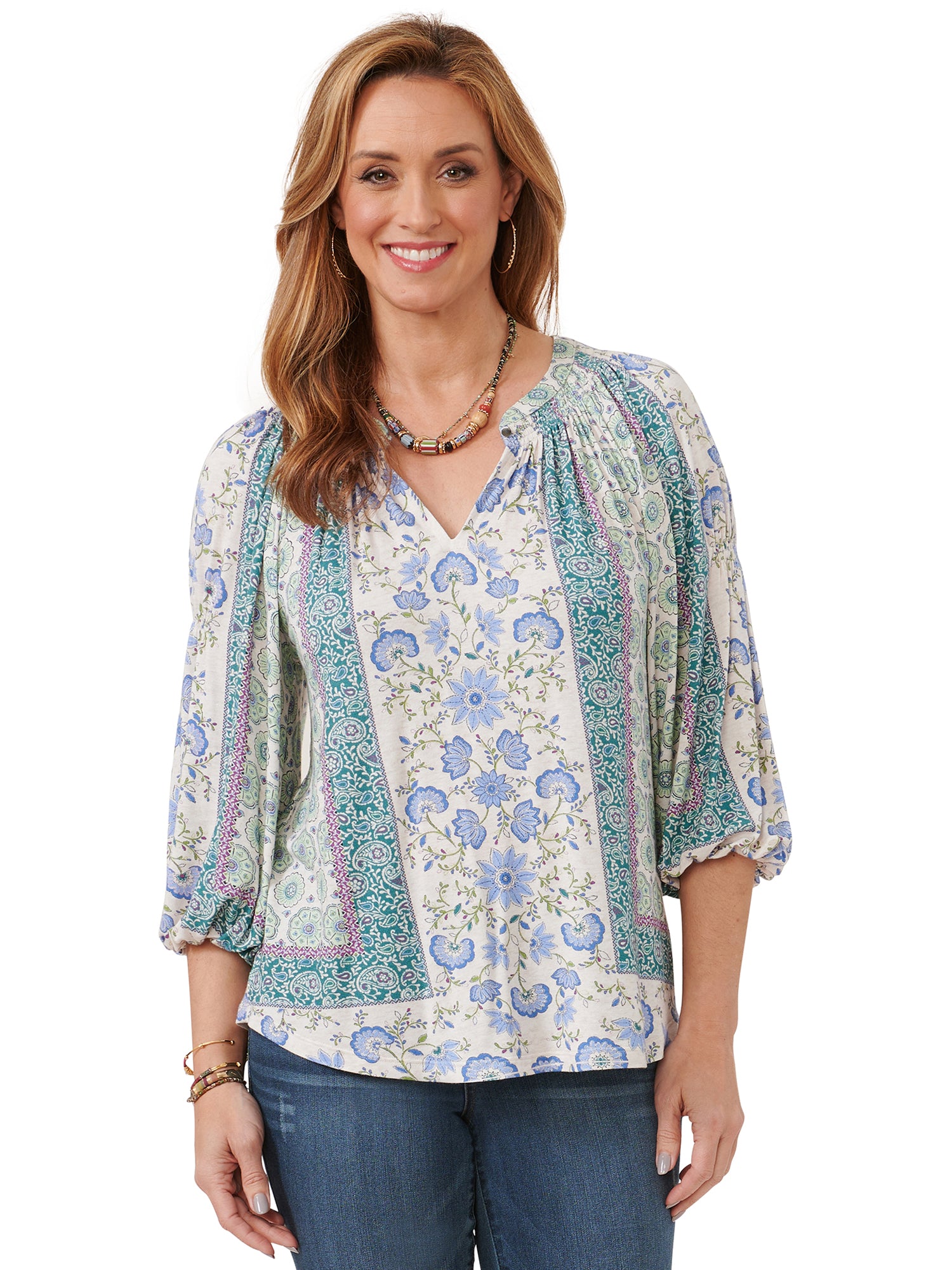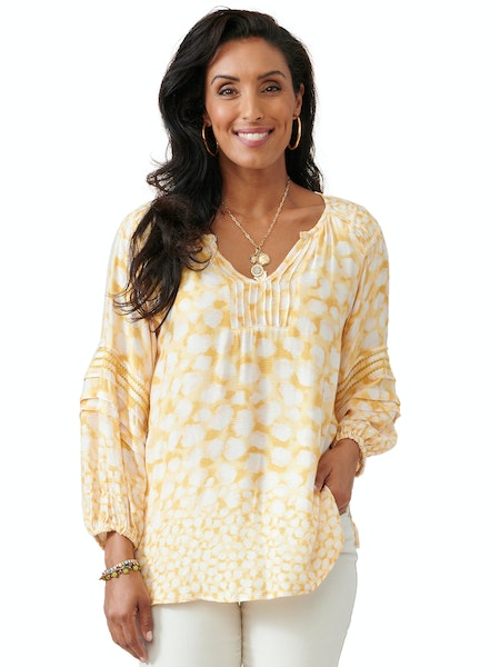 3/4 Blouson Pintuck Sleeve w/ Border Print