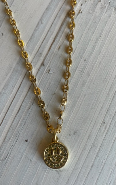 18K Plated pave Crystal Smiley Coin Charm on 15-17 Inch Chain