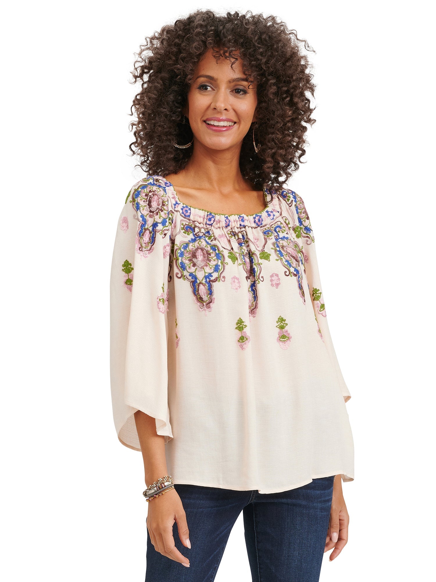 3/4 Bell Sleeve Embroidered Square Neck Woven Top