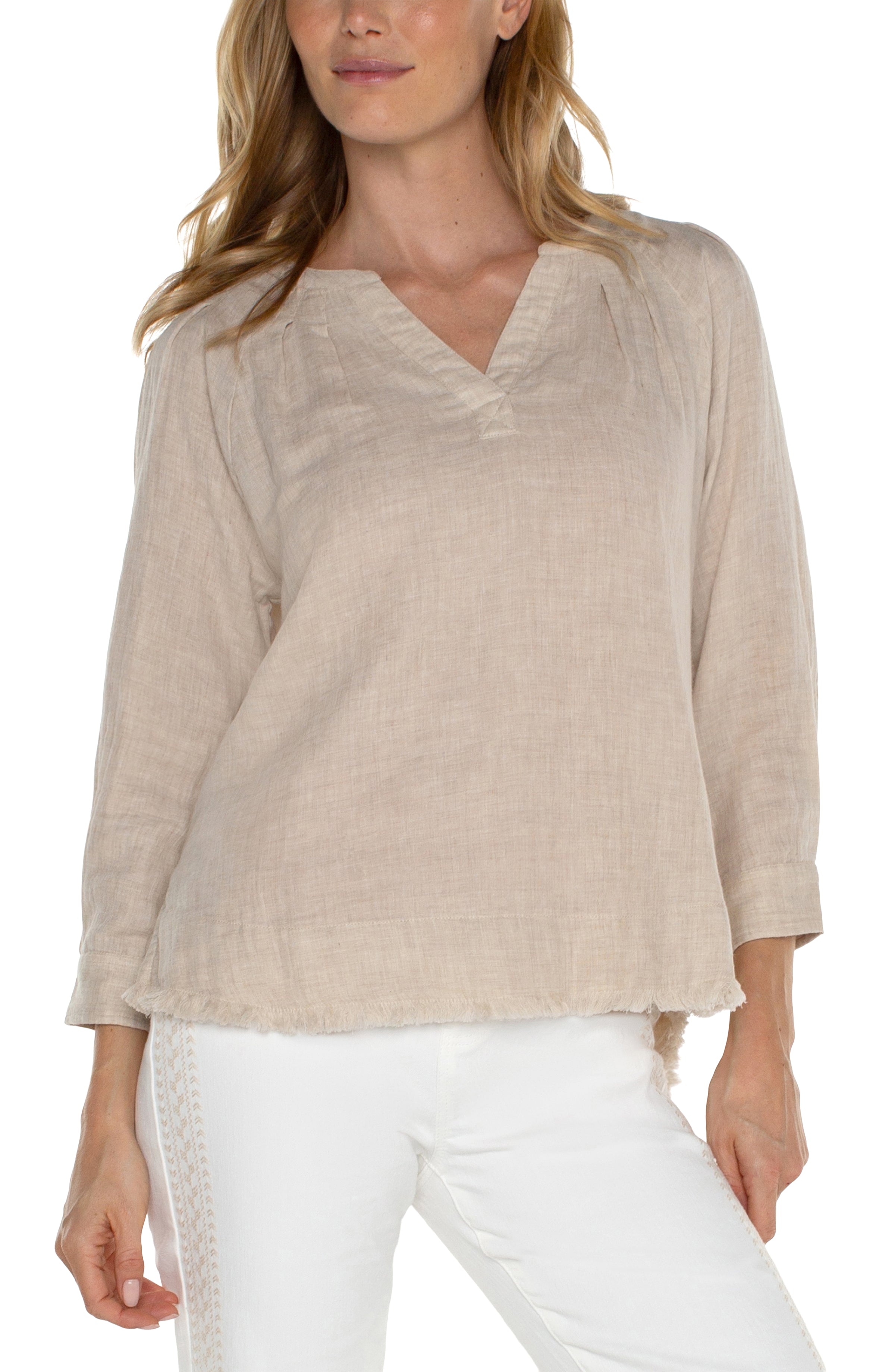 3/4 Sleeve Raglan Top w/ Pleats and Fray Hem