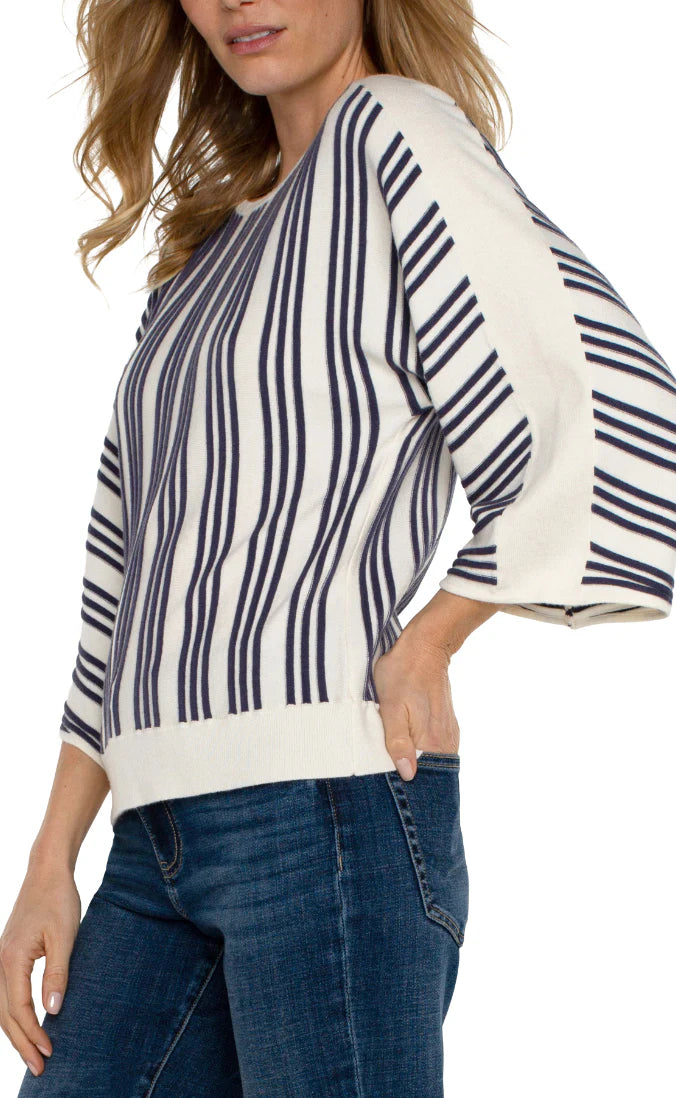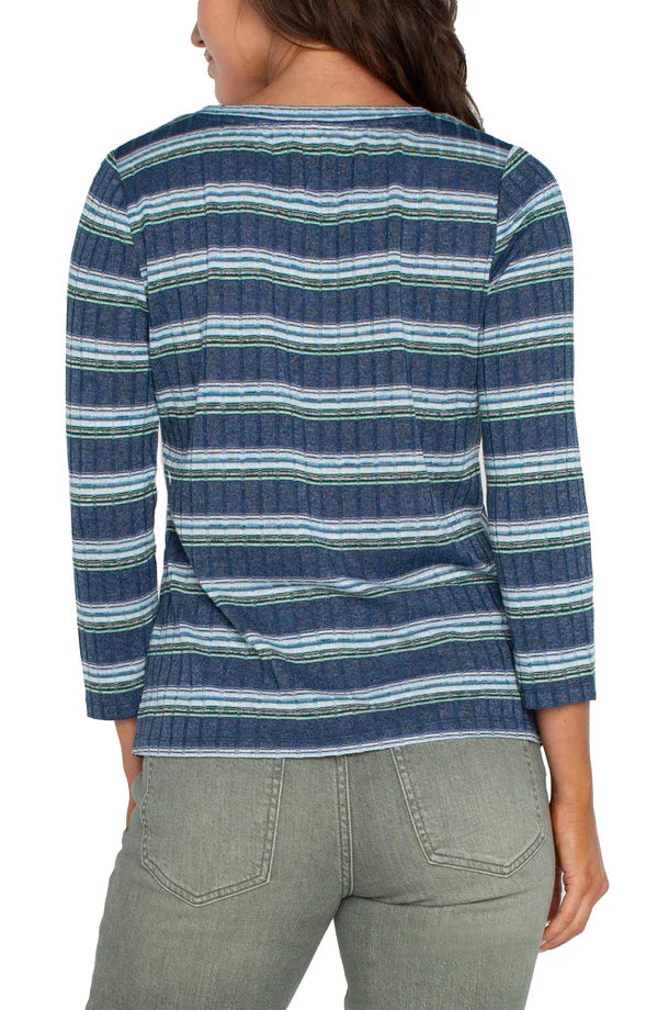 3/4 Pointelle Sleeve, V Neck Sweater w/ Stripe Tipping Detail