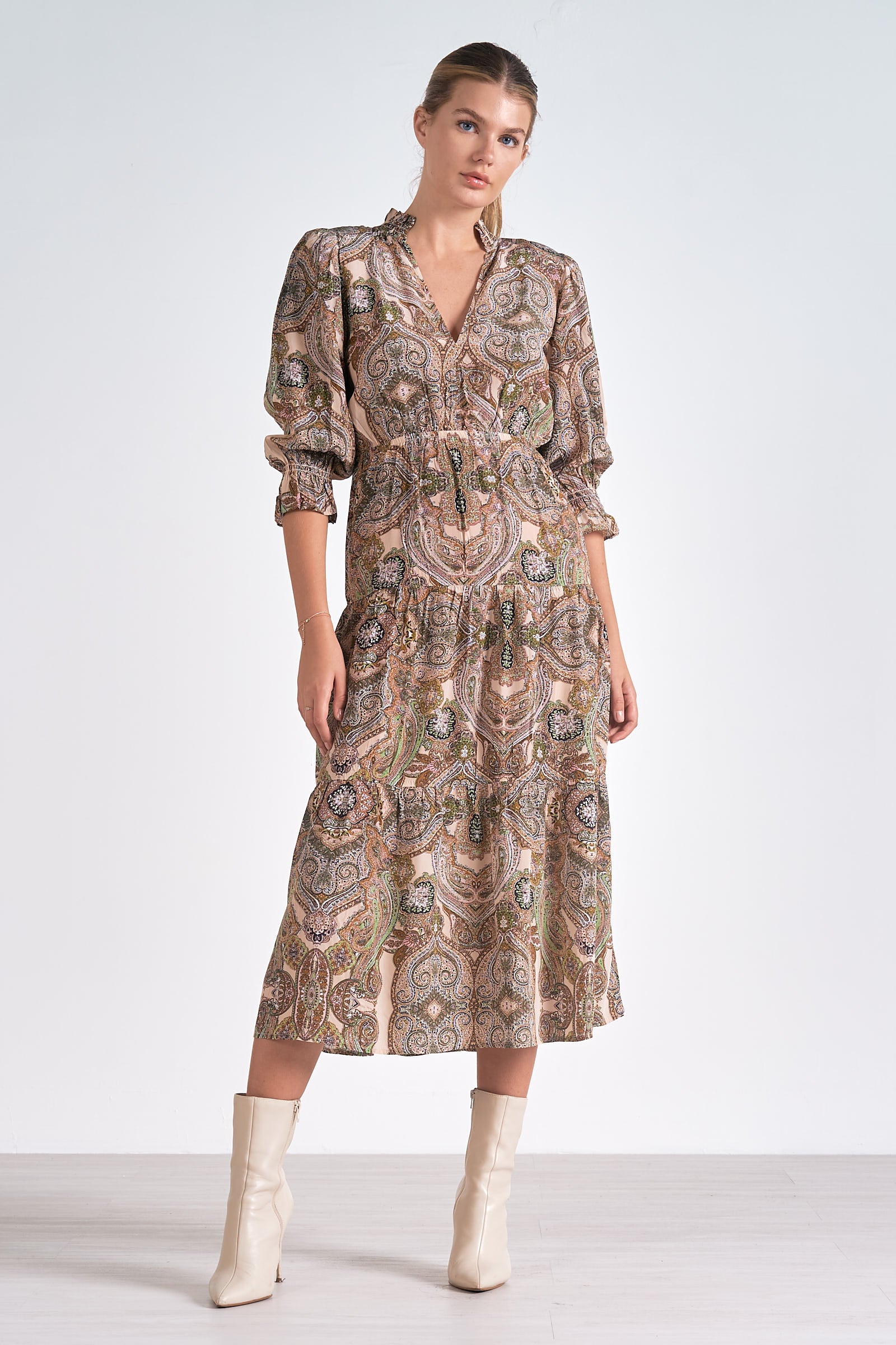 3/4 Sleeve V-Neck Midi Dress