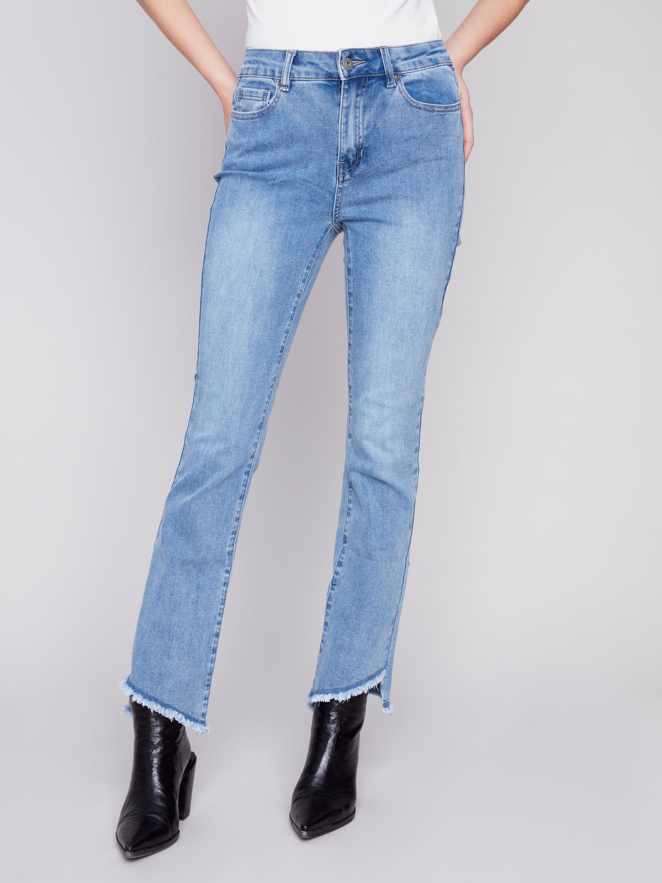 Asymmetrical Leg Opening Fringe Hem Flare Stretch Denim Pant
