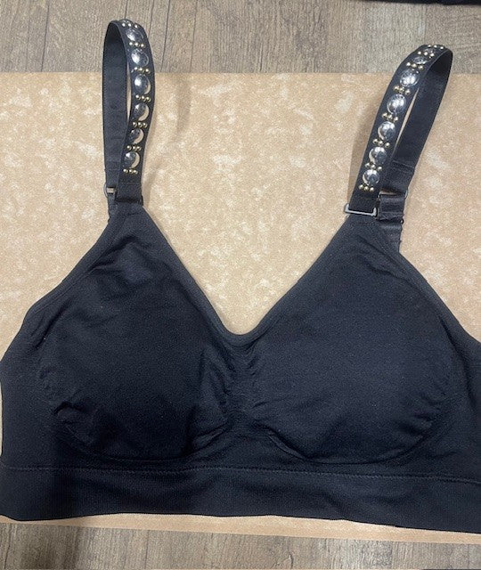 Padded Bralette w/Two Tone Studded Straps. Gold & Silver Studs on Black Strap. 92% Nylon, 8% Spandex.
