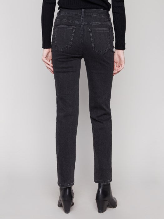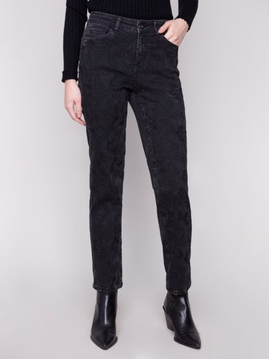 Straight Leg Stretch Denim Pants With Allover Tonal Embroidery