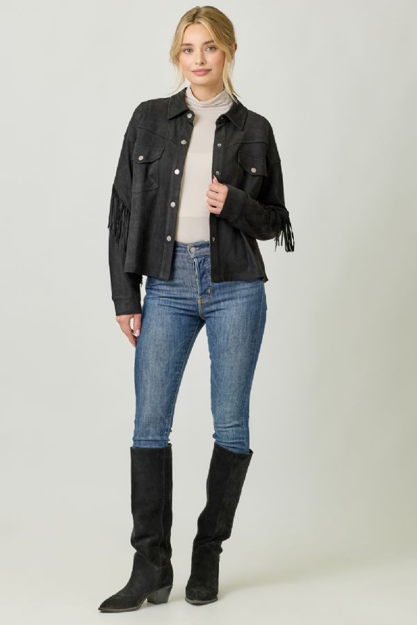 Fringe back detail suede shirt jacket. Snap buttons front closure. Buttoned flap bust pockets. Fringe detail on back and sleeves. 97% Polyester, 8% Spandex.