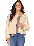 Long sleeve jacket w/inverted back pleat & corduroy contrast.