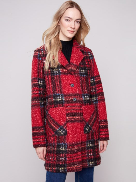 Plaid Boucle Knit Tailored Collar Coat With Button Front And Patch Pockets