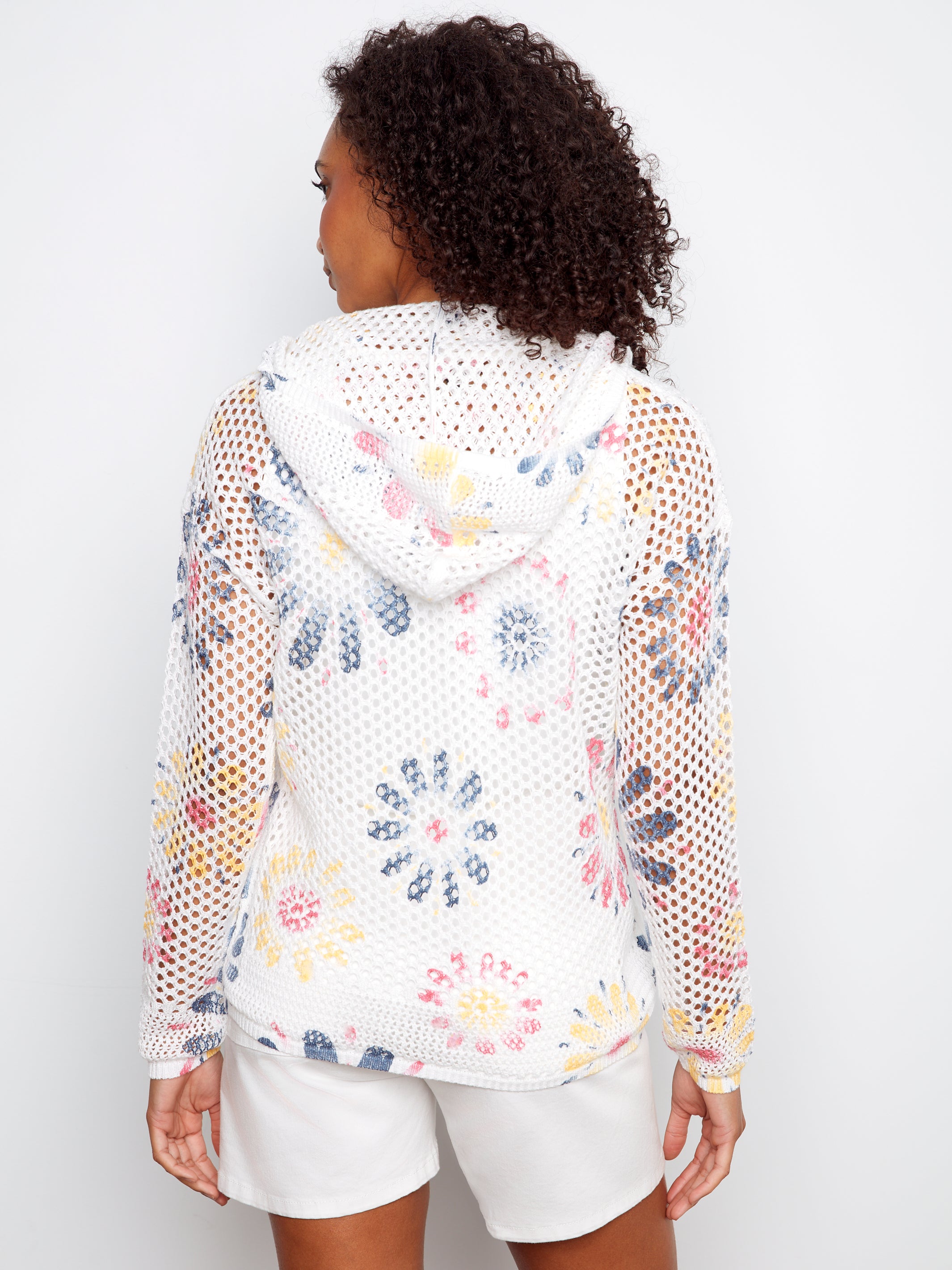 Printed Long Sleeve Fishnet Crochet Hoodie Sweater