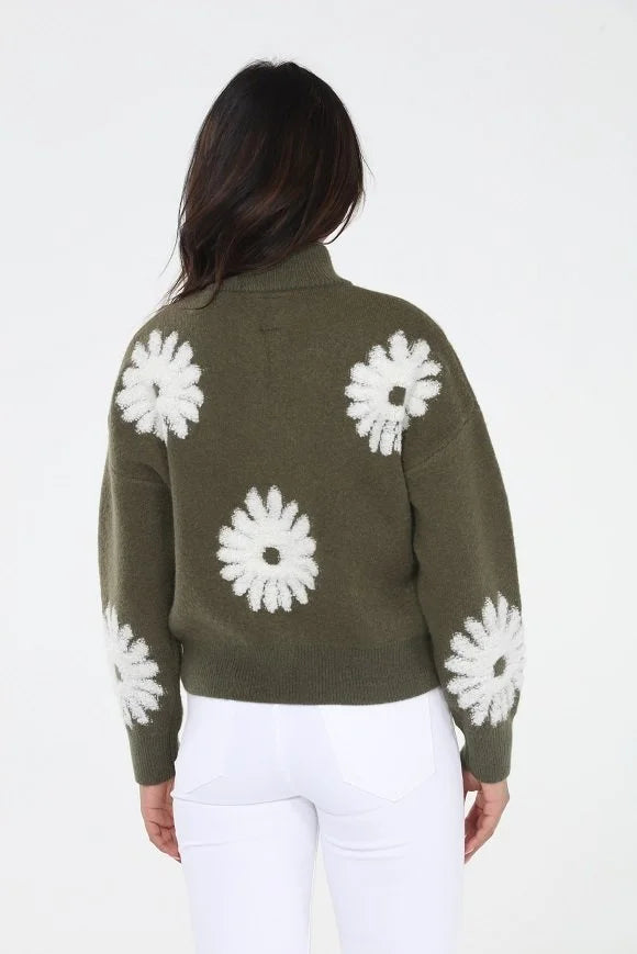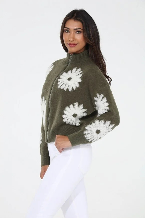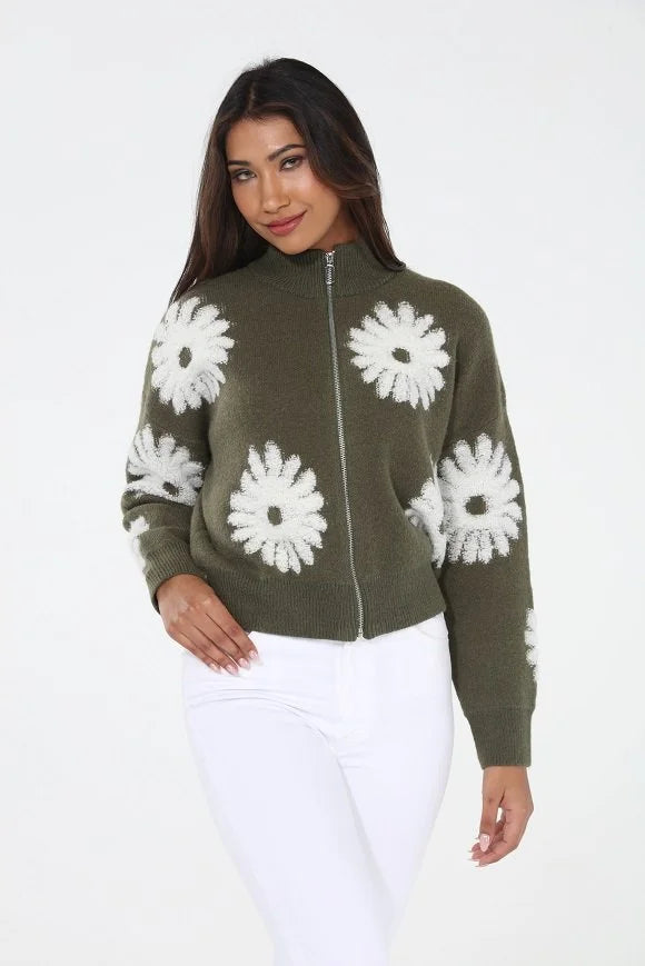 Cozy Zip-Up Jacket w/High Neck and Floral Patterns