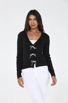 This charming cardigan features a bow embellishment, a V-neck design, and a beautiful knit pattern, perfect for adding elegance to your outfit.