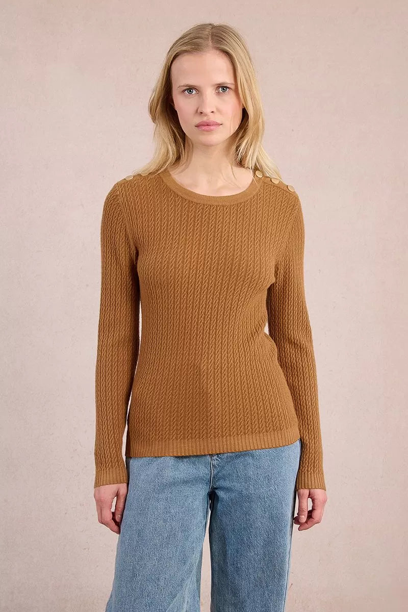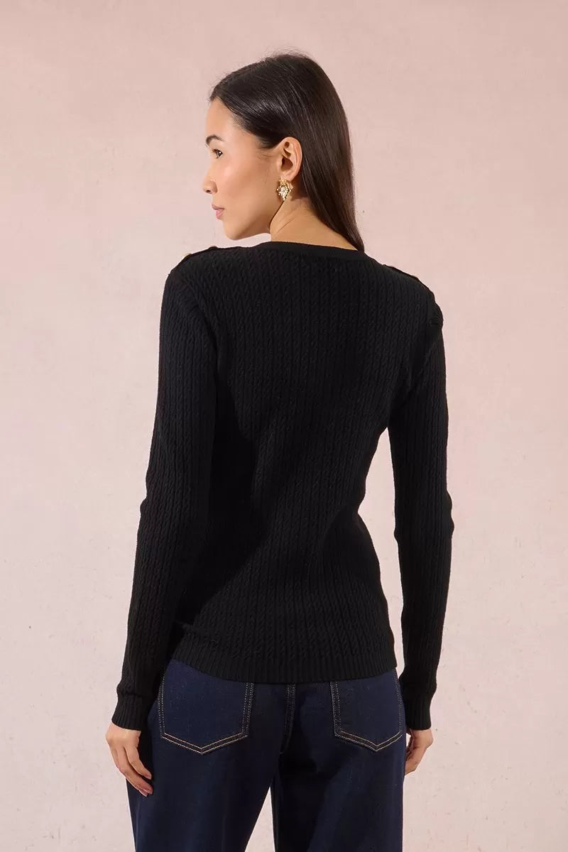 Cable Knit Sweater w/Buttoned Shoulder Tab