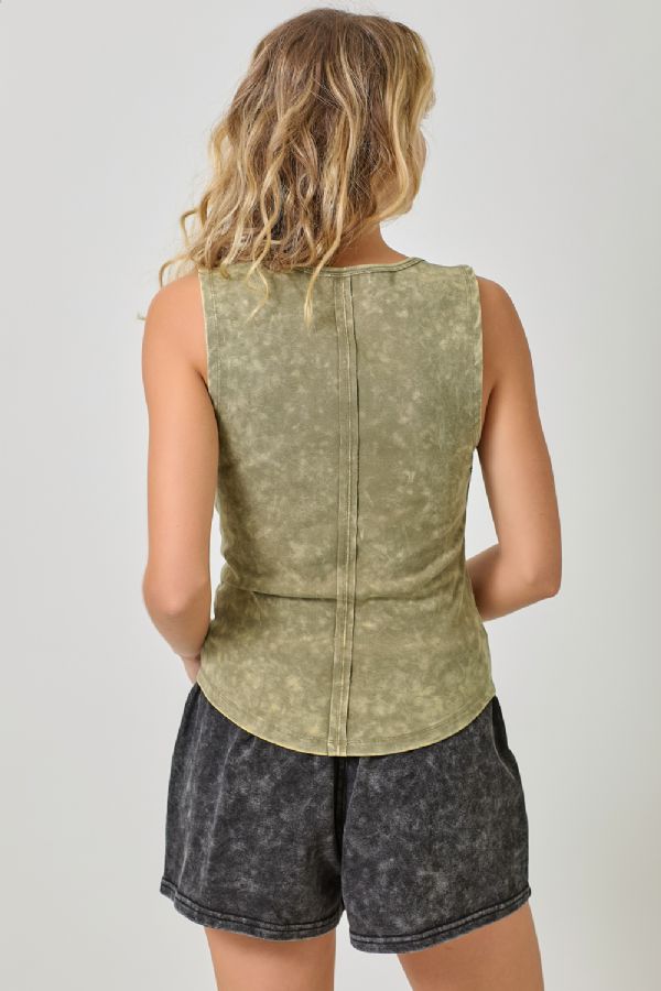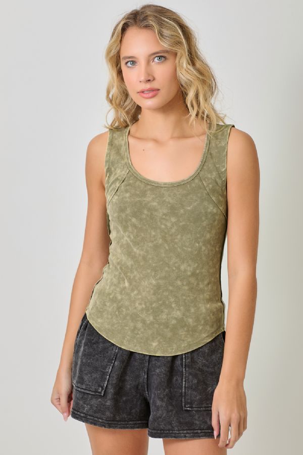 Raw Cut Edge Tank Top. Scoop neck, Hi-lo hem. Cut edges on sides and back. 45% Cotton, 45% Rayon, 10% Spandex.