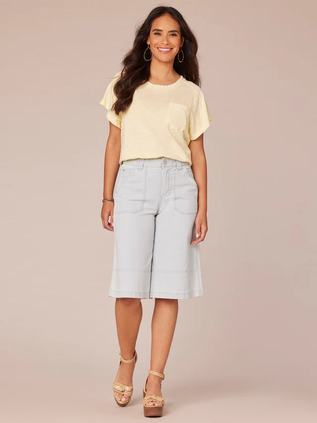 Short Sleeve Scoop Neck Embroidered Pocket Knit Boyfriend Tee. 60% Cotton, 40% Modal.