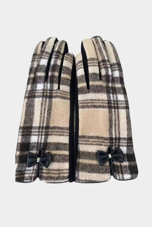 One Size Material : 100% Acrylic Chic touchscreen gloves featuring a plaid pattern and stylish bow detail
