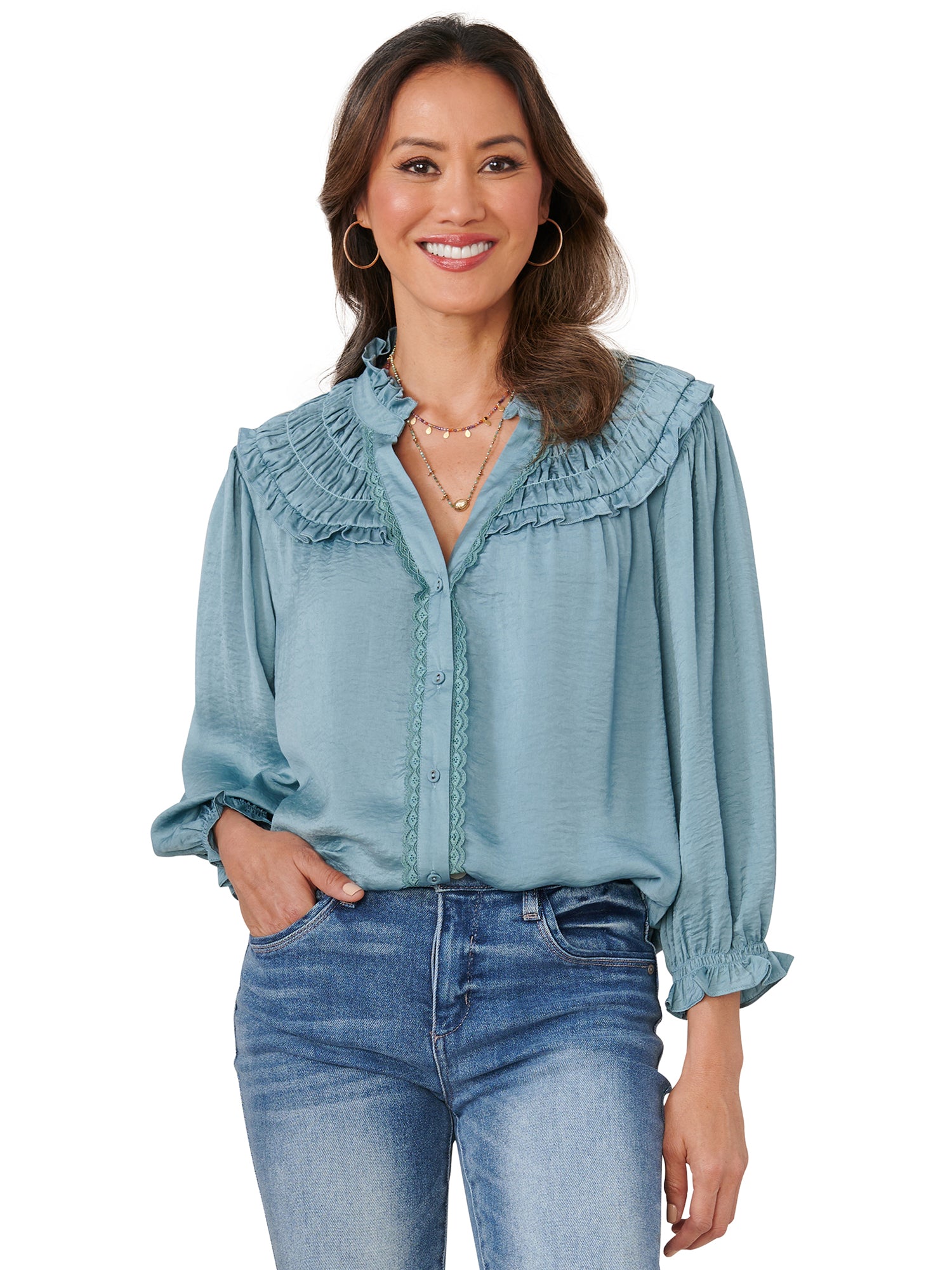 Button Down Top w/ Ruffle Edge Neck and Ruched Yoke