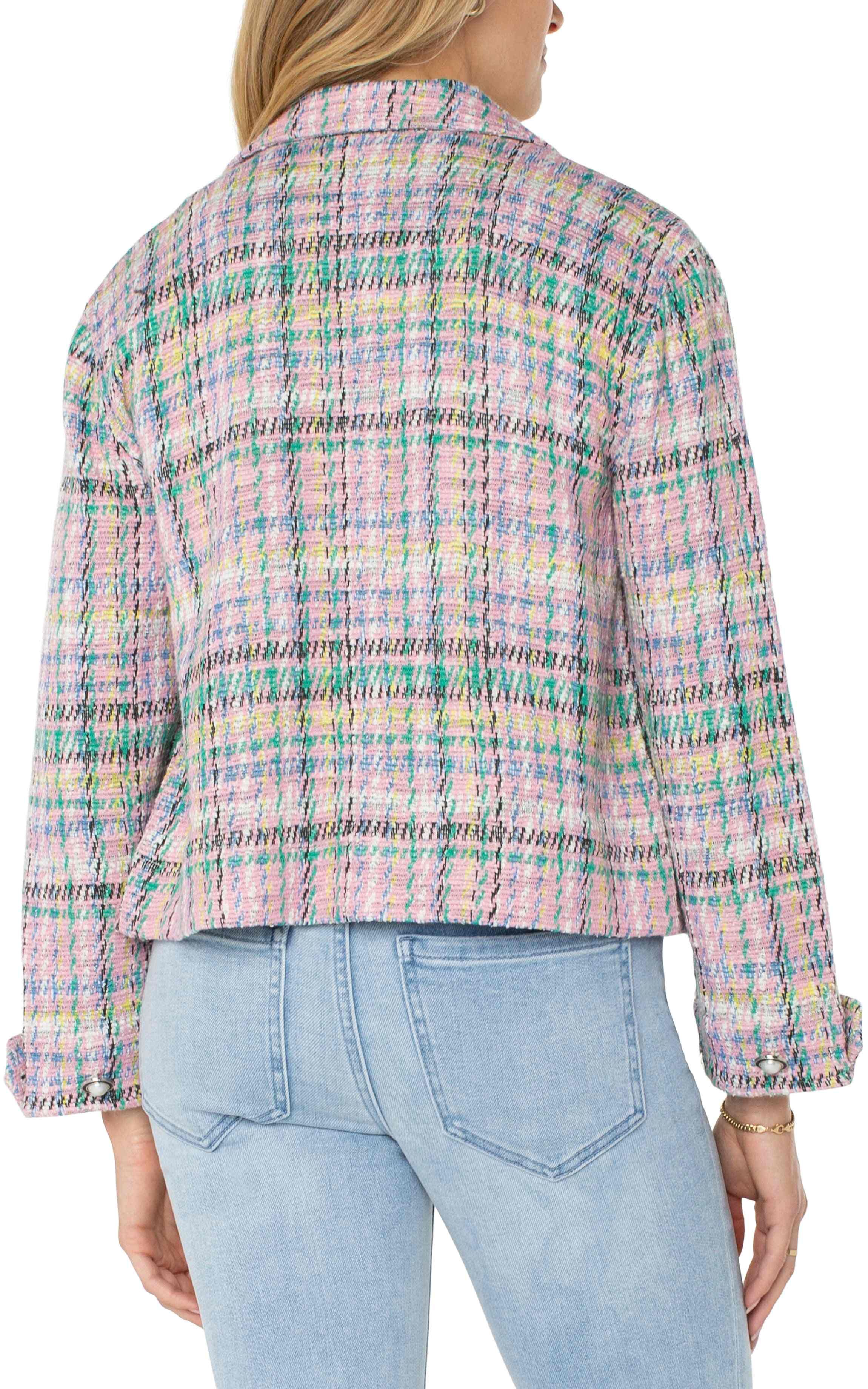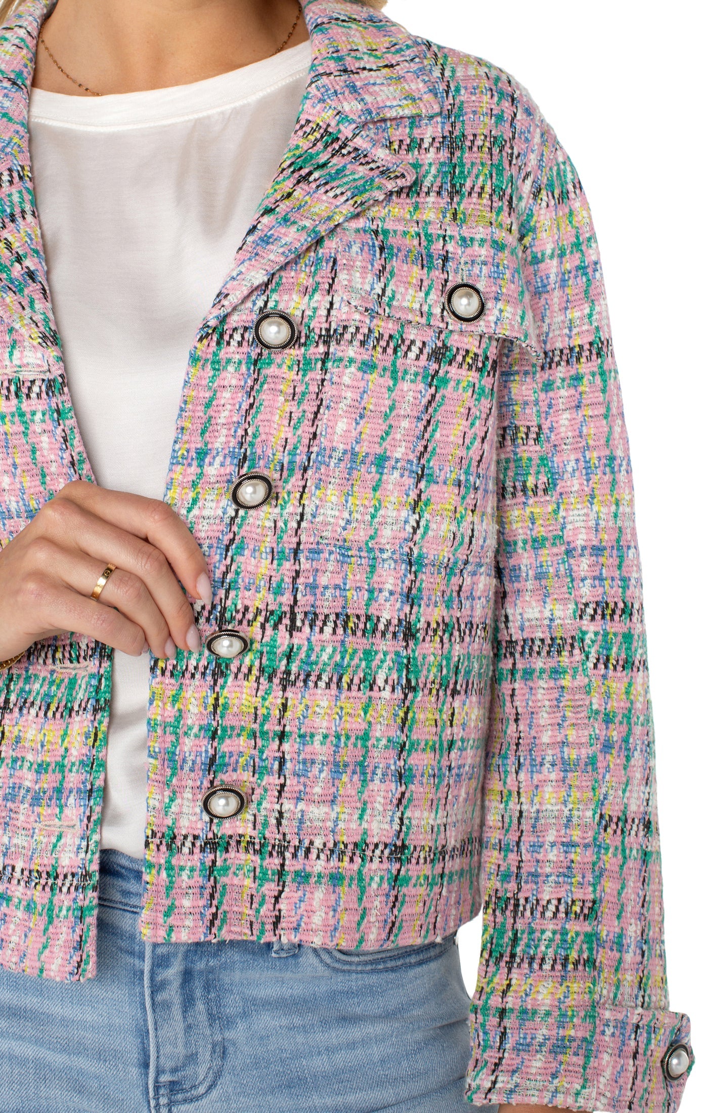 Upgrade your wardrobe with this stunning boucle knit boxy shacket in a beautiful tea rose multi-color. Combining a soft, textured knit fabric with exquisite buttons, it effortlessly merges comfort and sophistication.