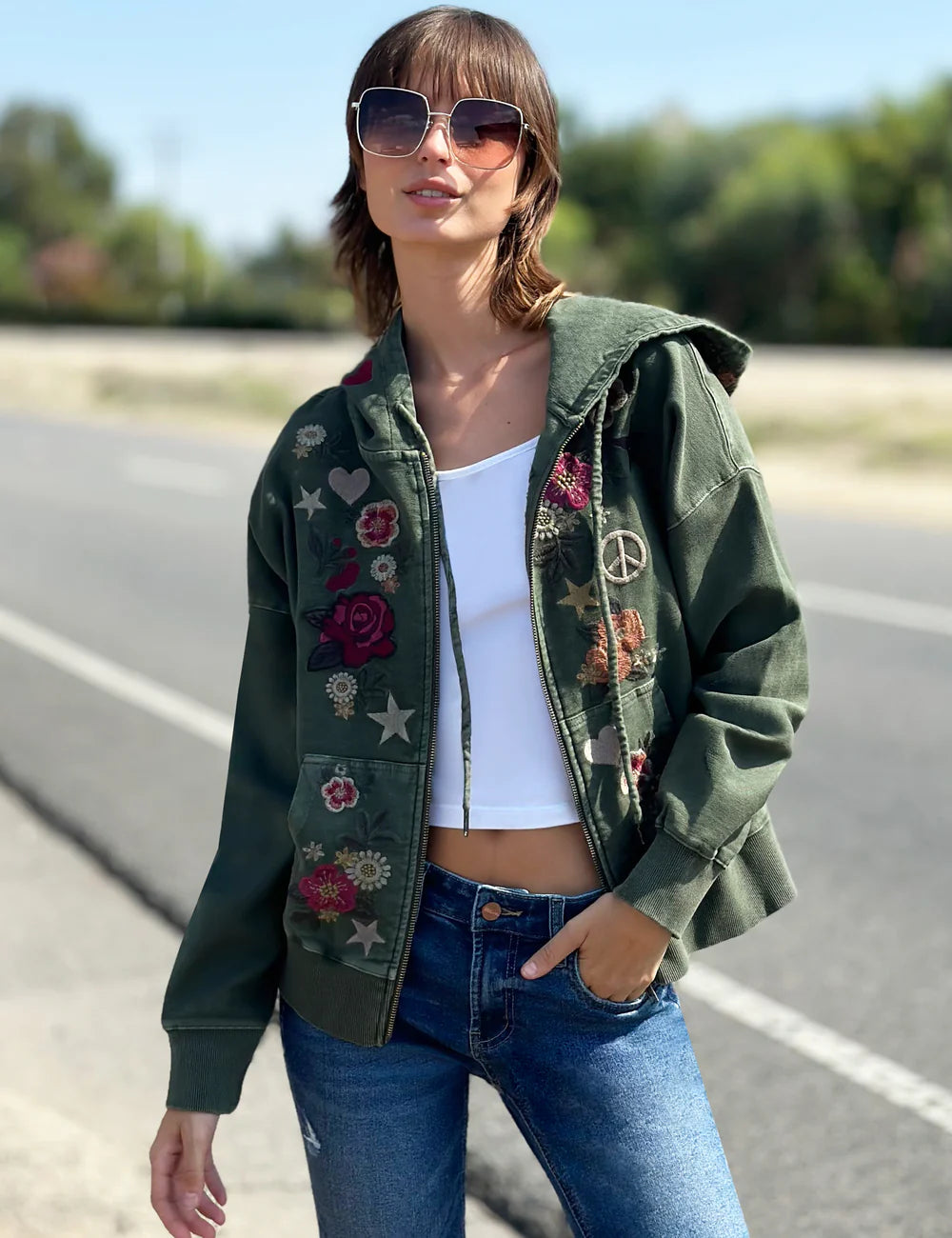 Camp Happy Green Hoodie w/Embroidery Detail. 76% Cotton, 18% Rayon, 4% Lyocell, 2% Spandex.