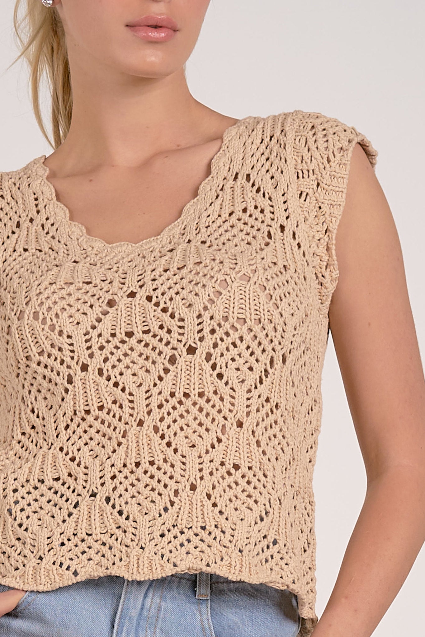 Cap Sleeve Crochet Sweater. 70% Cotton, 30% Nylon.