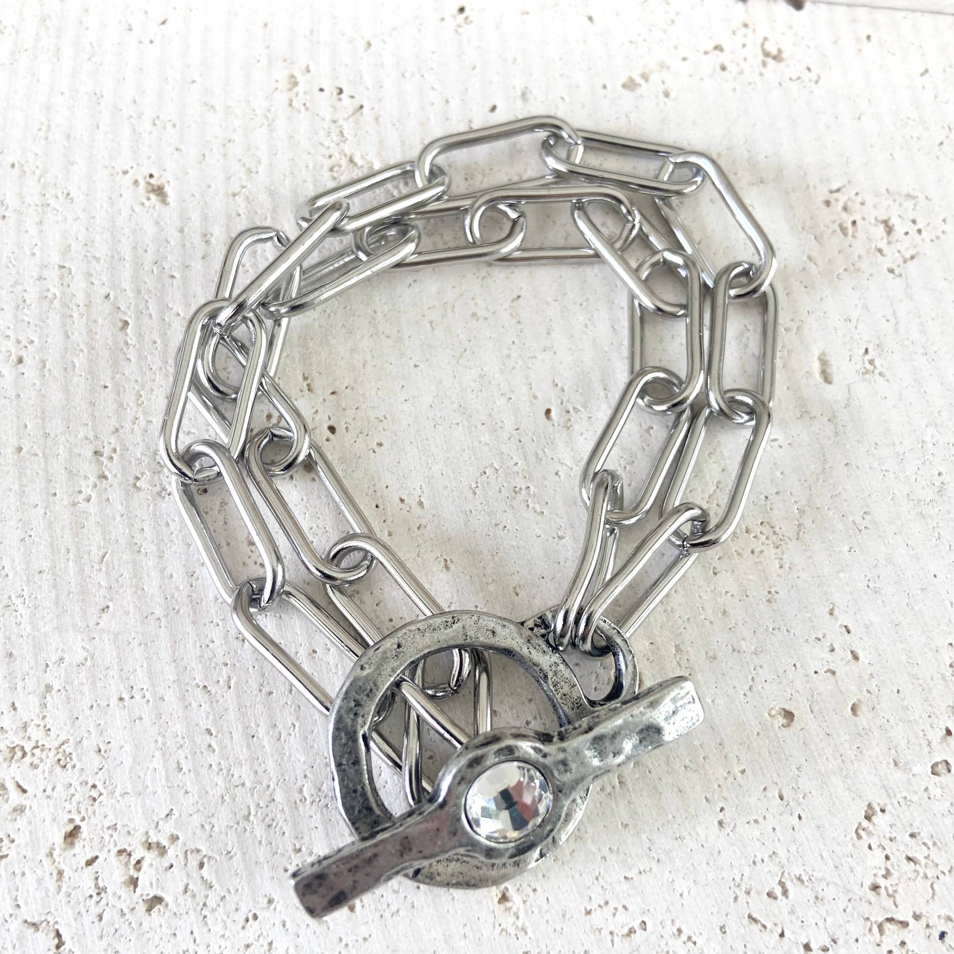 These are a fabulous new spin off design of one of our bestselling bracelets. We used the same handcasted toggle with the clear Swarovski crystal but added non tarnishing paperclip chain. Very edgy glam. Choose your colors