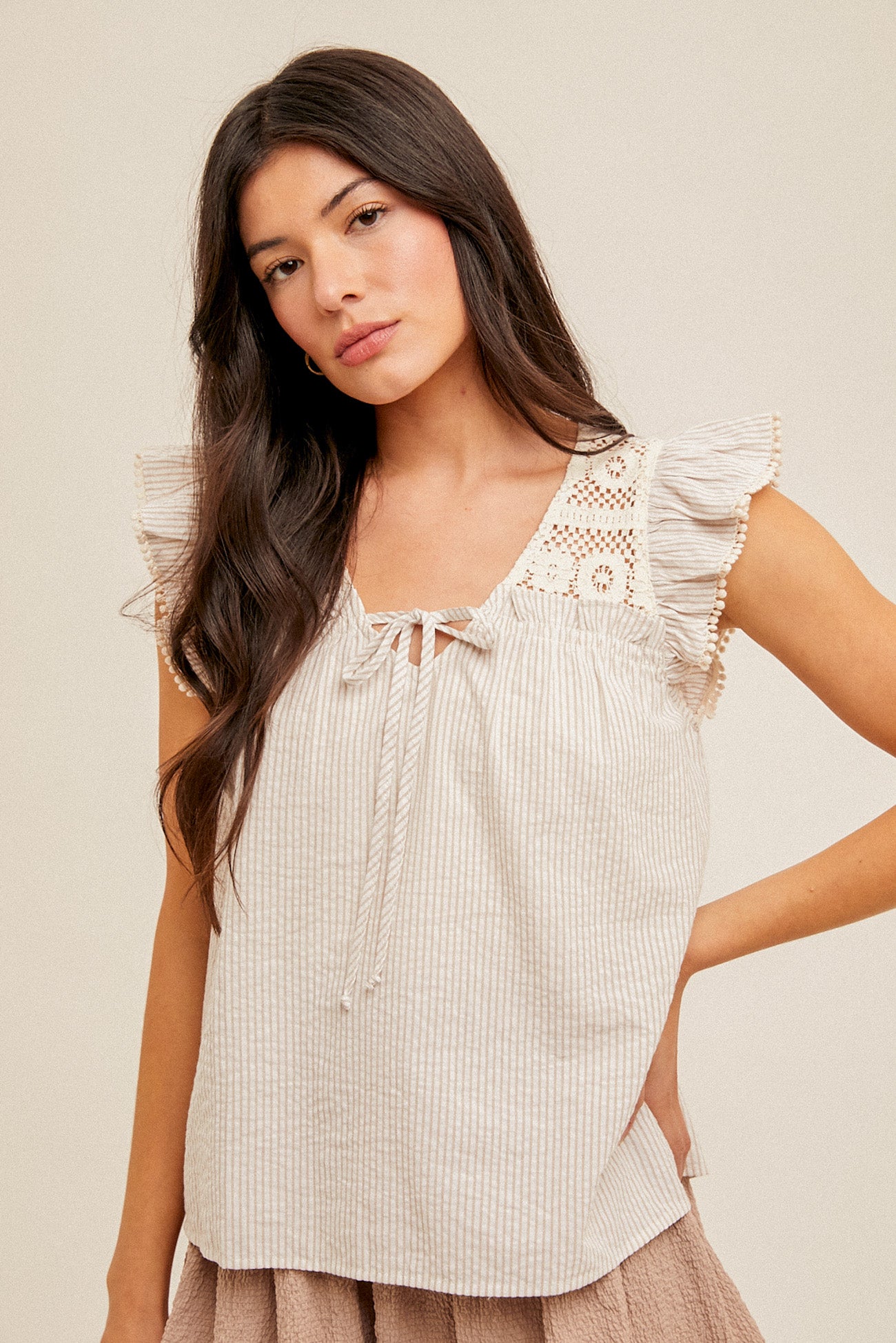 Crochet Trimmed Stripe Flutter Sleeve Top