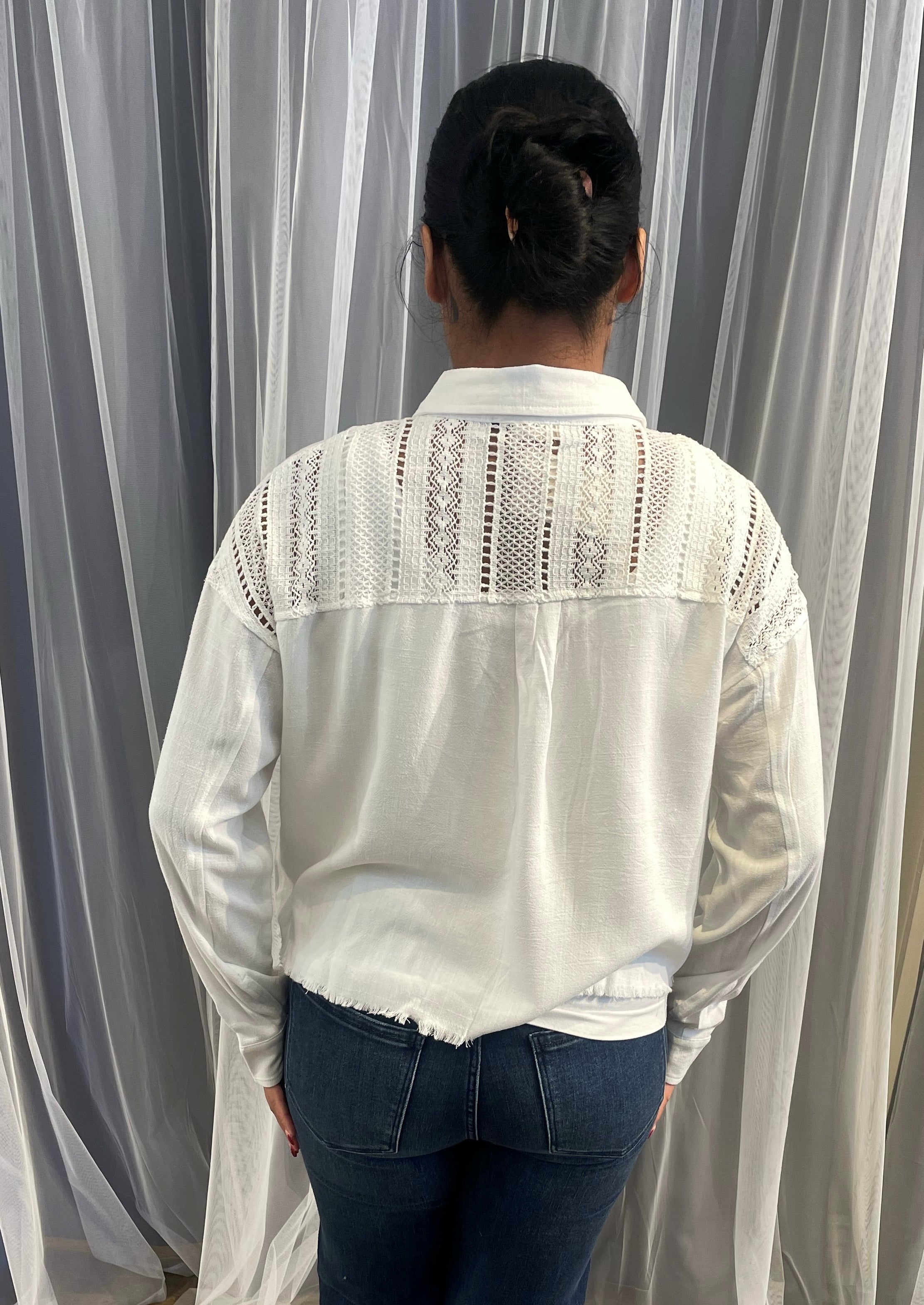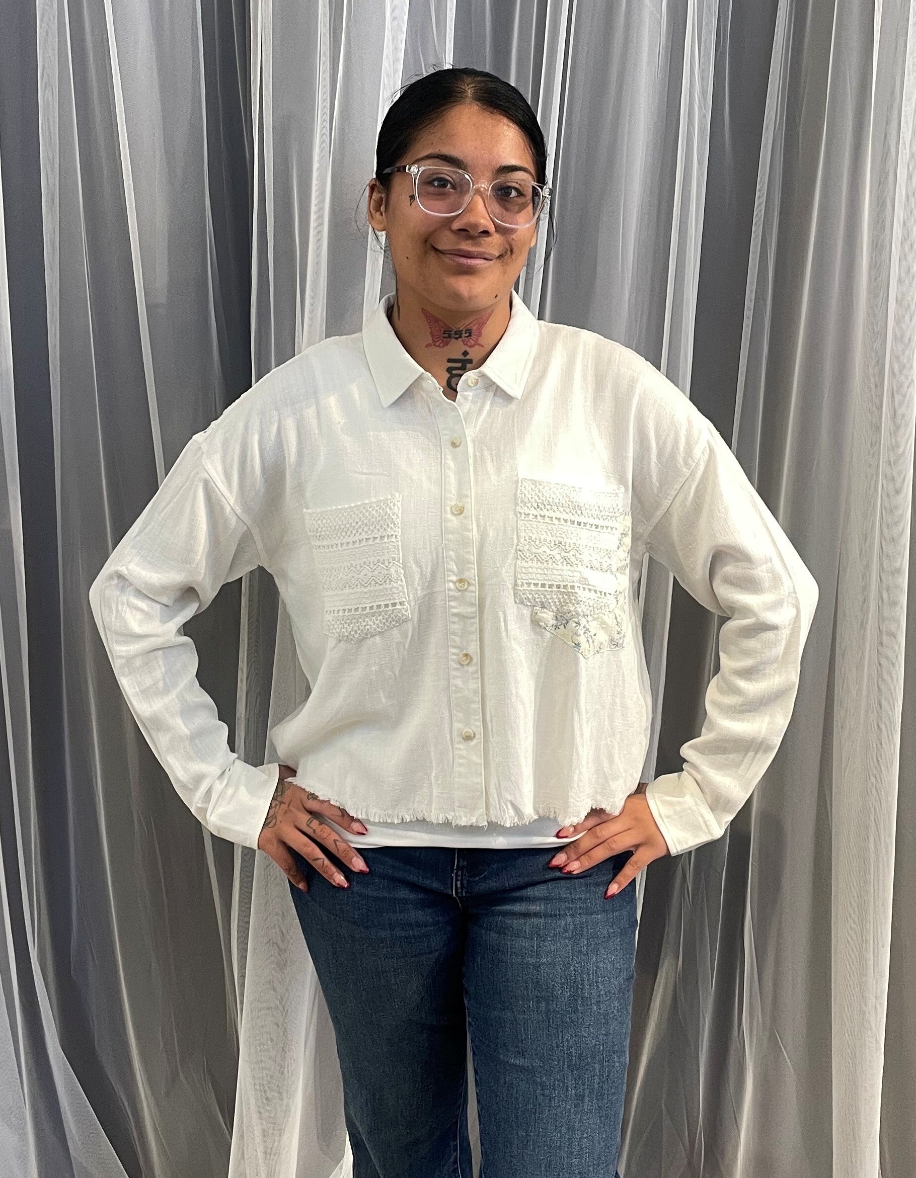 Ditsy Floral Print Contrast Crop Button Down Shirt w/Raw Hem. 70% Viscose, 30% Linen. Contrast 100% Cotton.
