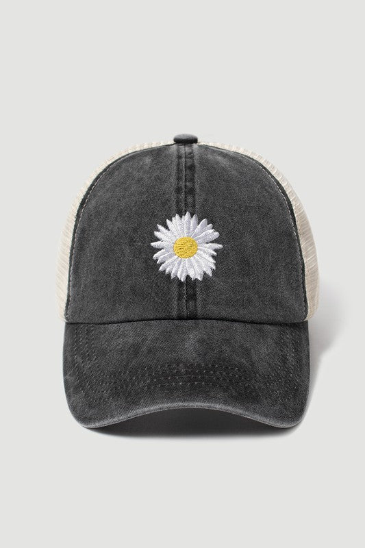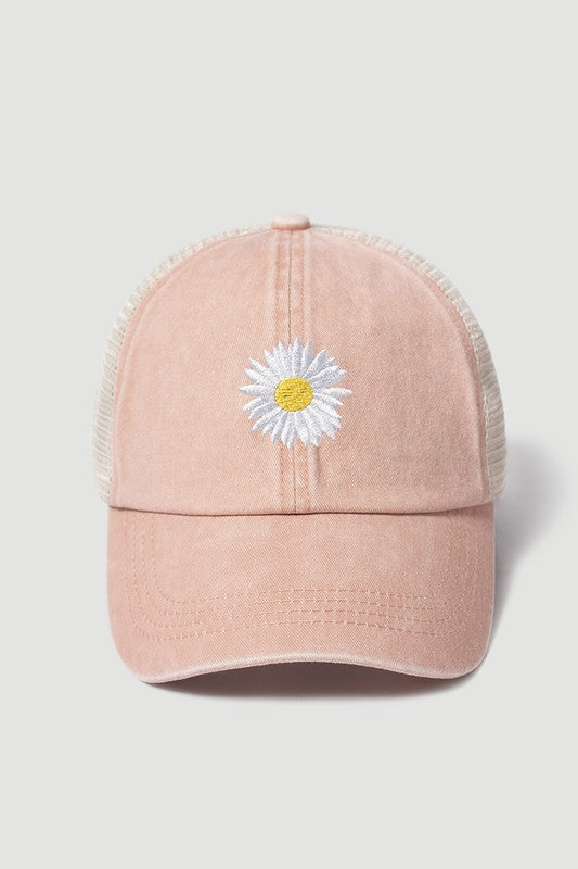 Daisy Flower Embroidered Baseball Hat w/ Mesh Back
