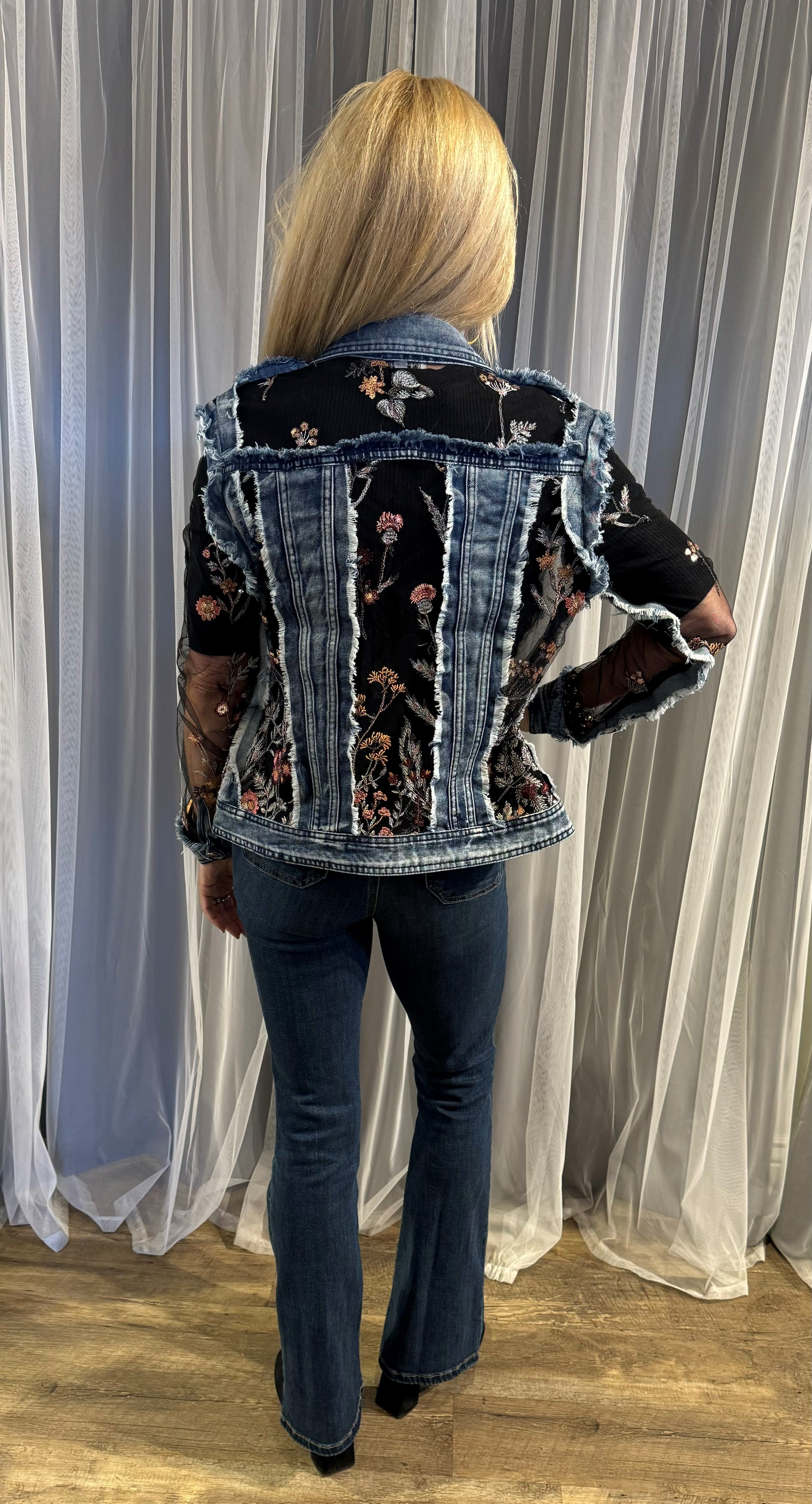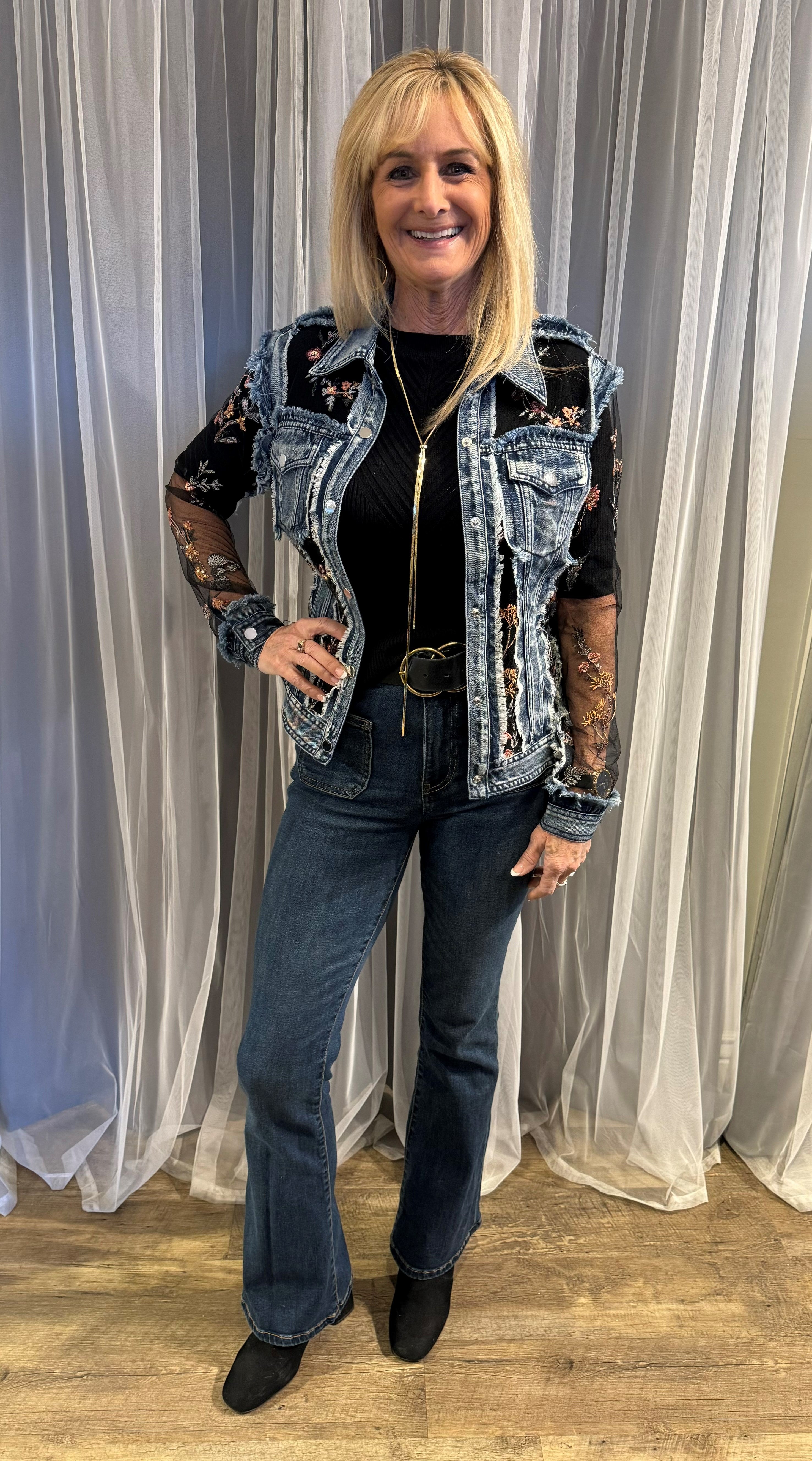 Denim Jacket w/Long Sleeve Black Lace and Embroidery. Snap Buttons. Shell #1 100% Cotton, Shell#2 100% Polyester.
