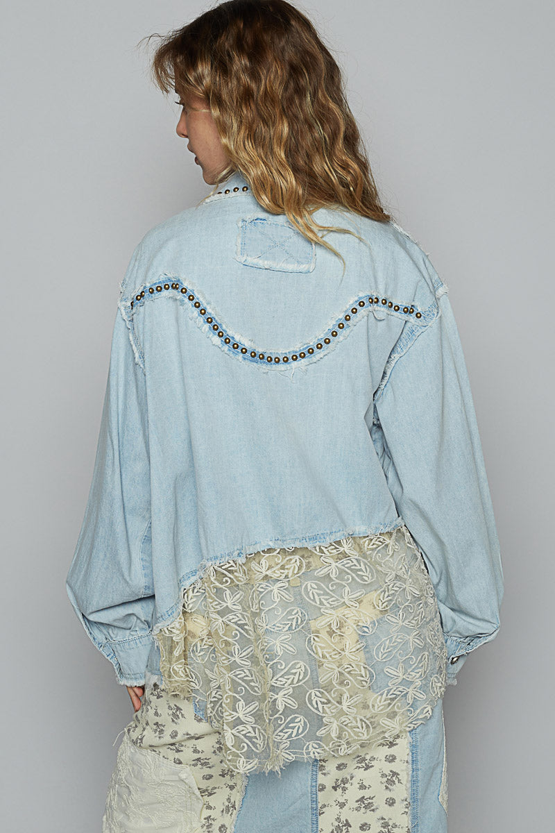 Denim Shacket/Shirt with Lace Back Detail and Studs