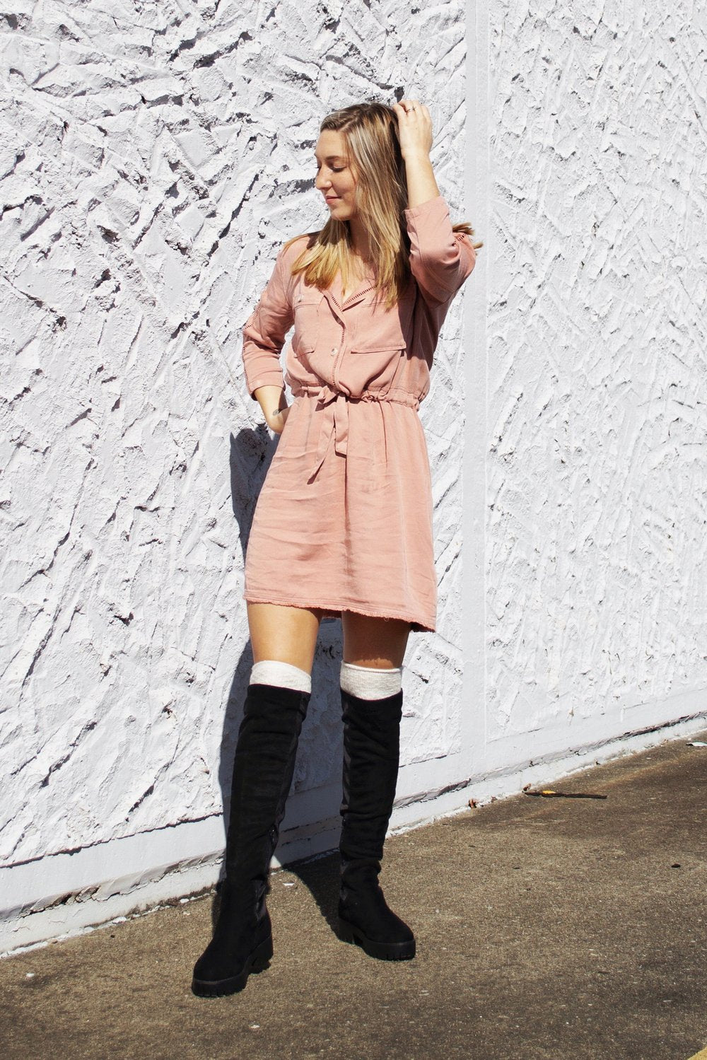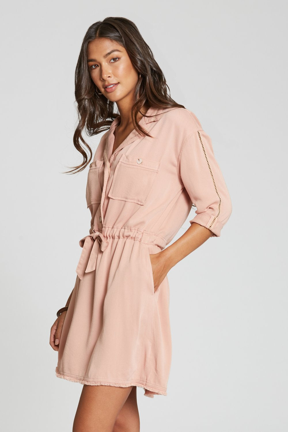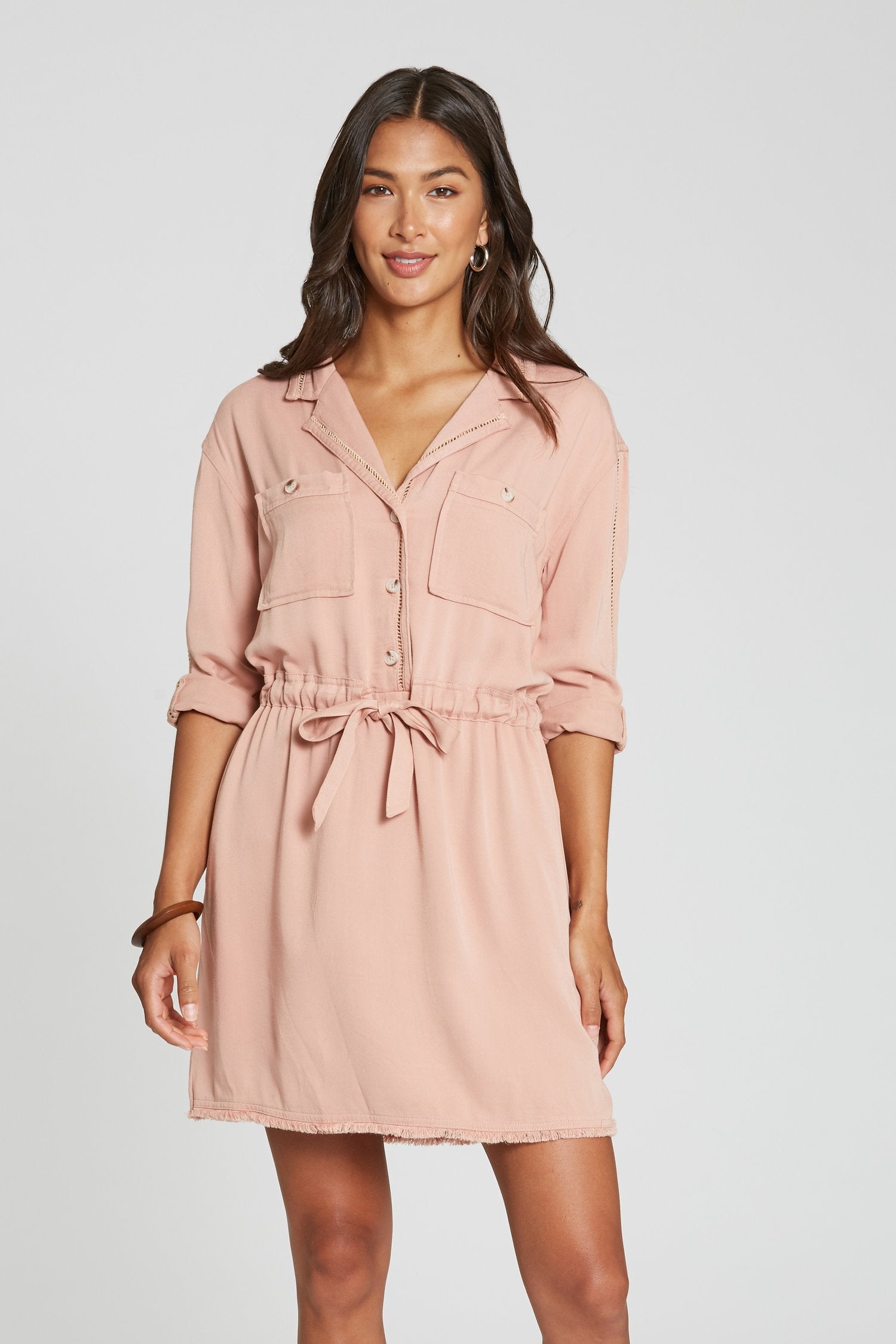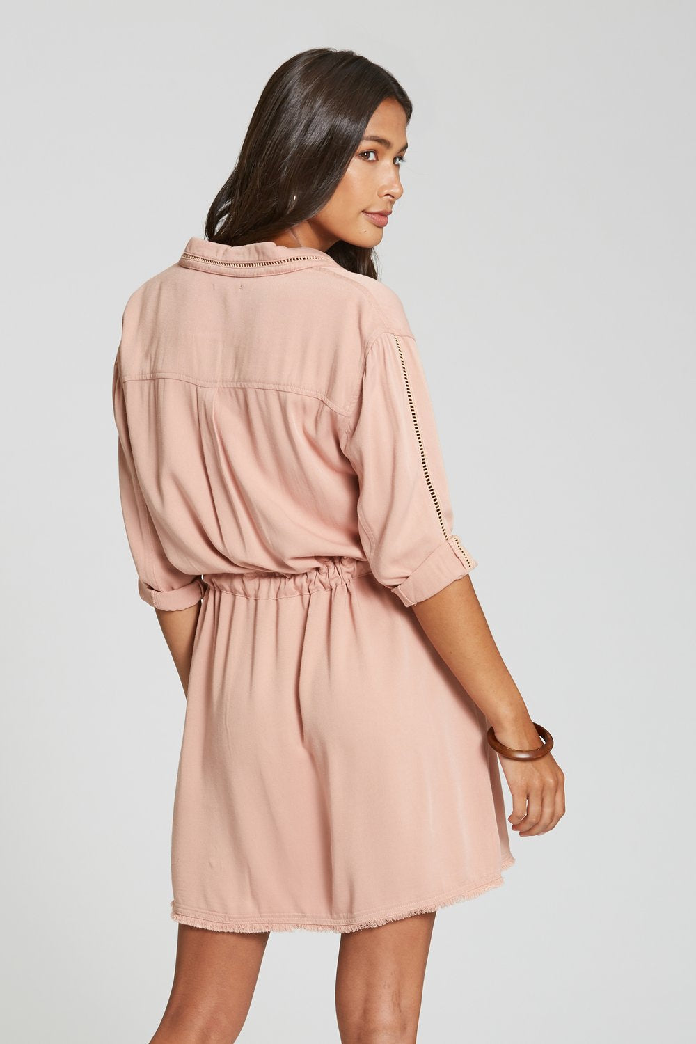 A waist cinching dress with trim insets, horn buttons and a frayed hem.