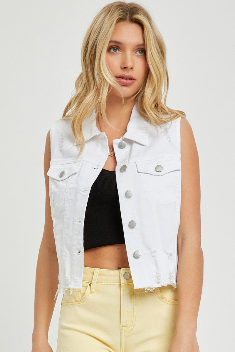 Distressed Crop Jacker Vest. 92% Cotton, 6% Polyester, 2% Spandex.