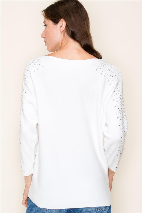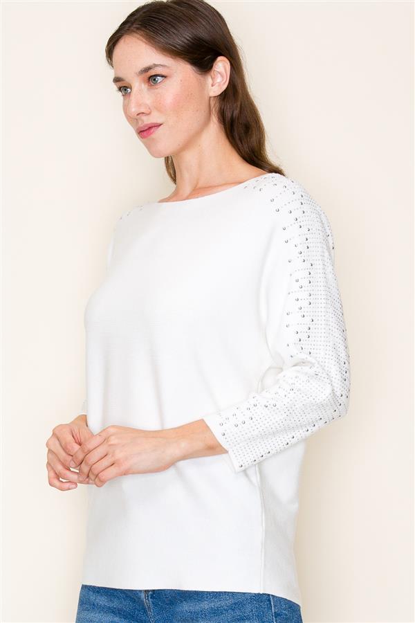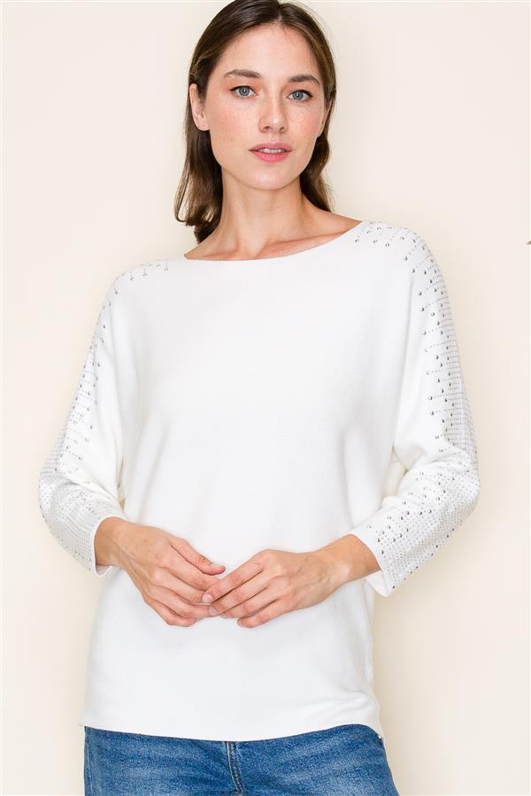 Rhinestone, Boat Neck, 3/4 Length Dolman Sleeve. 55% Viscose, 45% Nylon