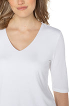 An effortlessly refined essential. This modern take on the classic V-neck is crafted from a soft, mini rib knit for a sleek, flattering fit. Designed with a front double layer for smooth, confident coverage, and finished with an elbow-grazing sleeve for a touch of sophistication. A versatile staple made to move from polished days to effortless evenings.