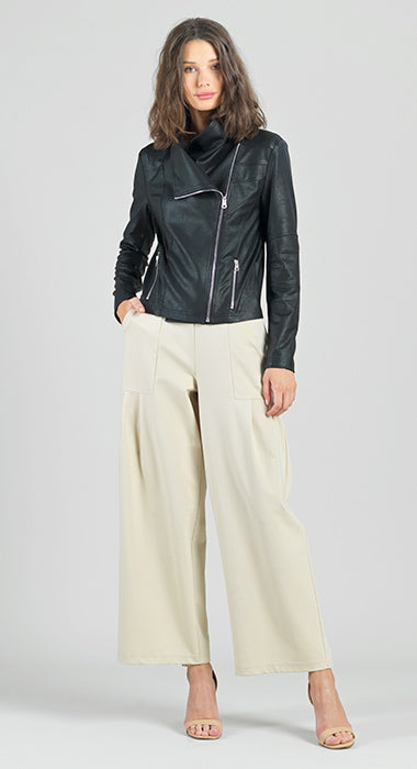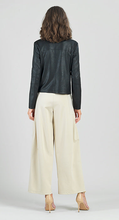 Liquid Leather Drape Neck Jacket w/Stitch Details. 95% Polyester, 5% Spandex.