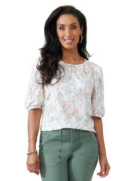 Elbow Puff Blouson Sleeve w/ Ruched Crew Neck