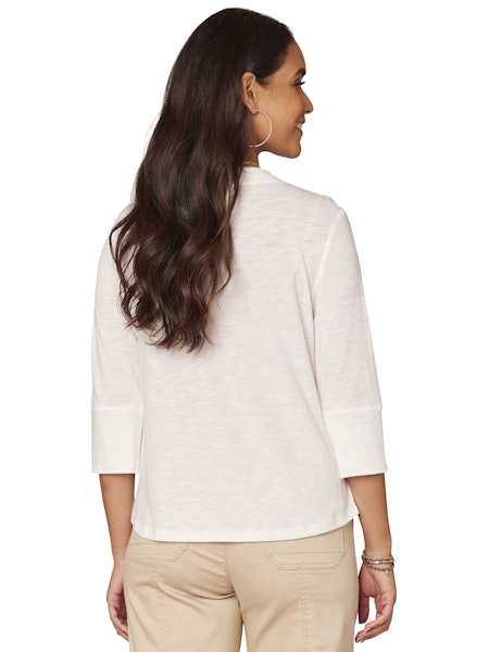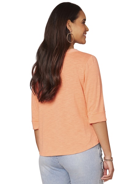 Elbow Roll Cuff Top. Ribbed V-Necklne. 52% Rayon, 48% Cotton.