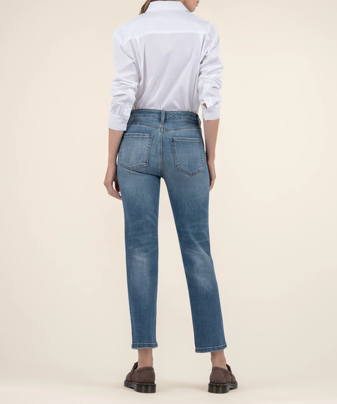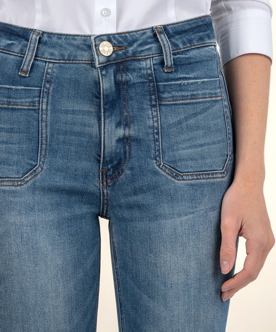 High Rise Straight Leg w/Front Inset Pocket. 93% Cotton, 6% Polyester, 1% Spandex.