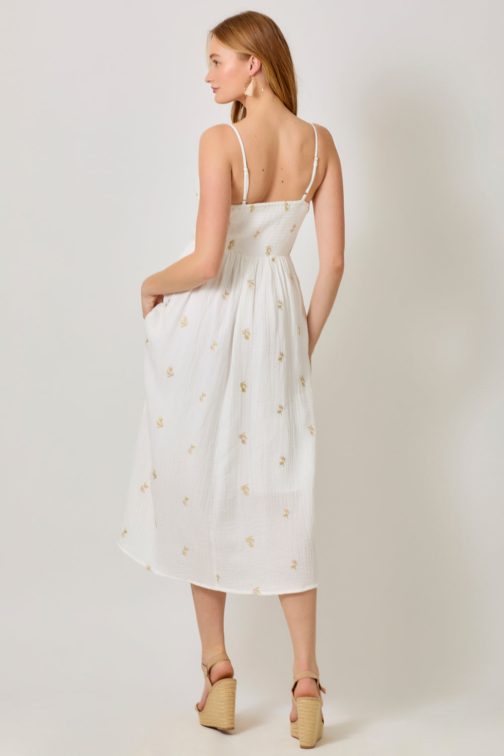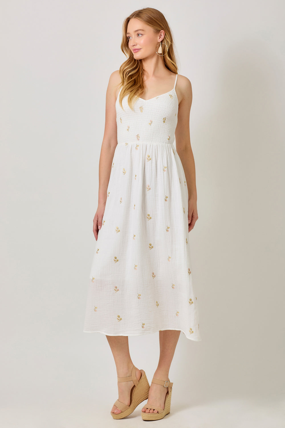 A-Line Embroidered Double Gauze Smocked Dress. Cinched Waist. Adjustable Straps. Midi Length. Shell 100% Cotton, Lining 100% Rayon.