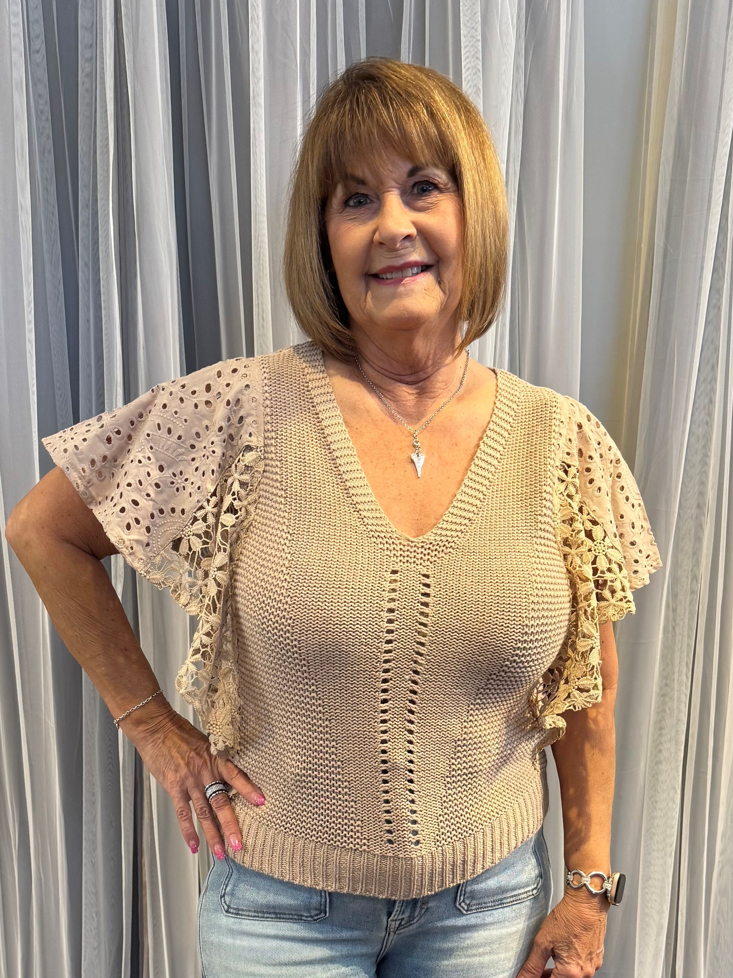 Flutter Short Sleeve V Neck Mix Media Sweater