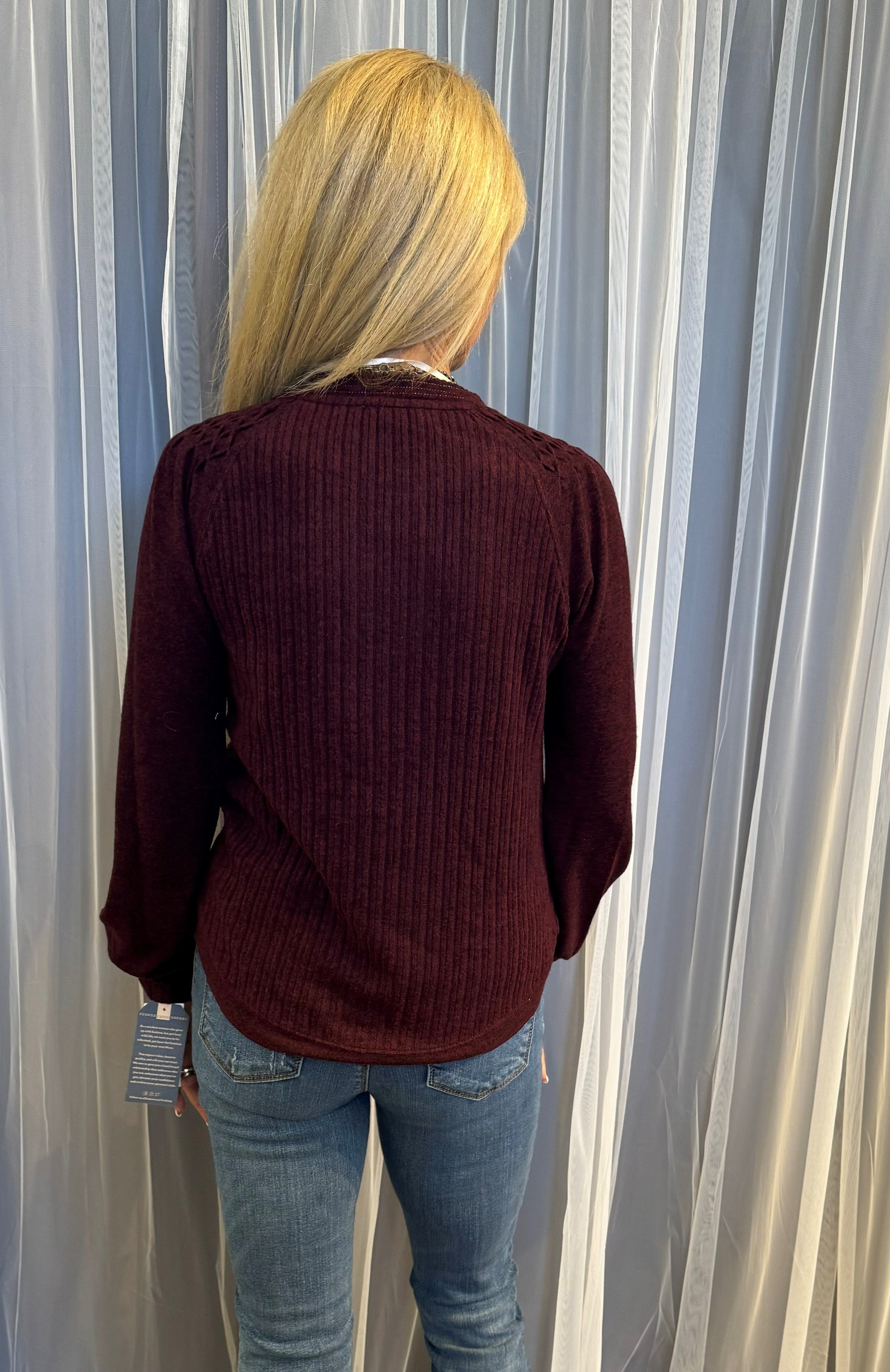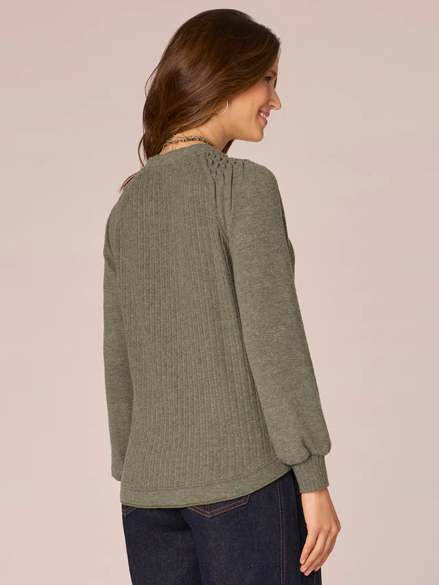Variegated rib knit. Mandarin collar w/half V-placket. Metallic contrast seaming. Mixed media design. Long smocked blouson raglan sleeve. Crimping shoulder detail. Round surplus hem. 68% polyester, 28% rayon, 4% spandex.