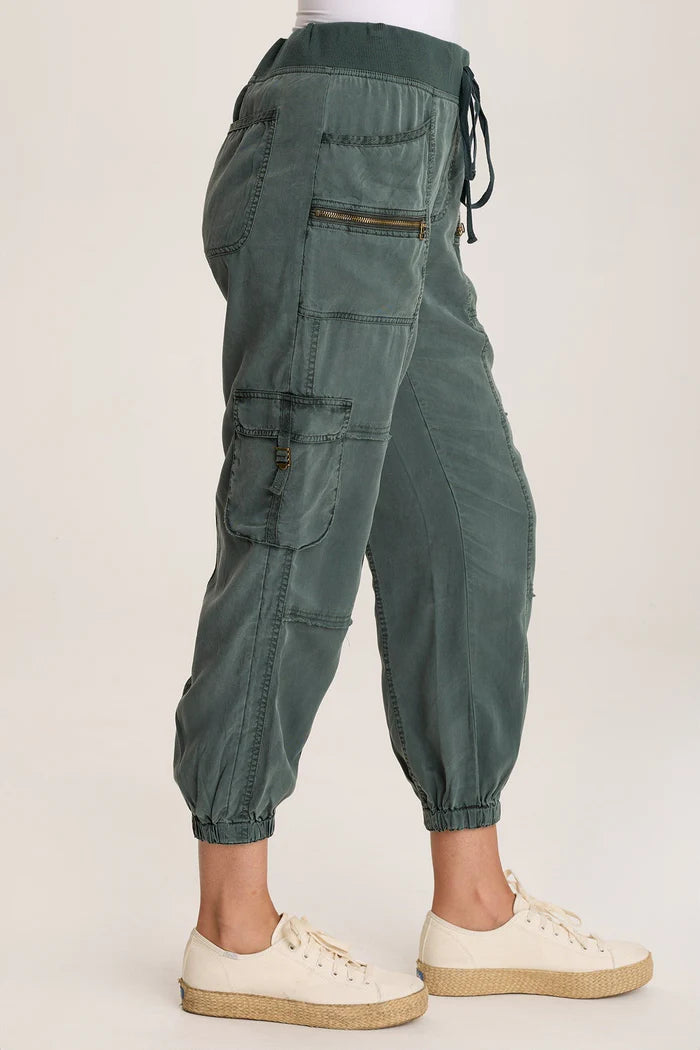 A soft twill crop with jogger-inspired banding at the leg opening and a pull-on waist. Hansa offers a classic cargo look, complete with plentiful pockets graced with antique brass hardware.