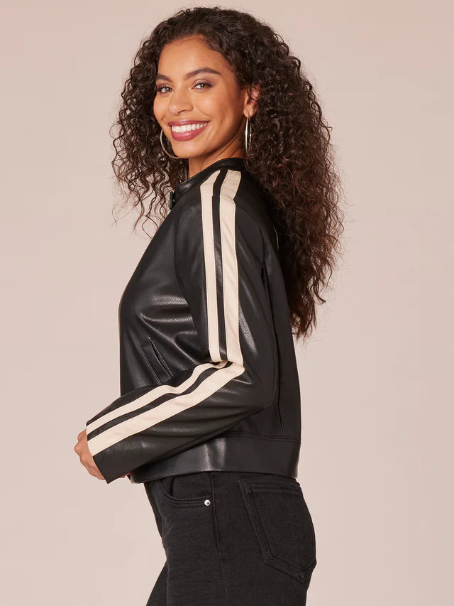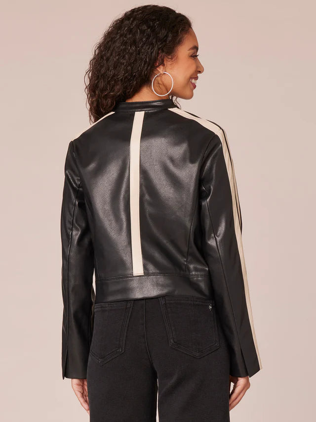 Long Sleeve Zip Front High Round Neck Biker Jacket with Welt Pockets. Woven stretch pleather. Back center seam. Angled welt pockets. Straight hem. 100% polyurethane.