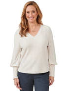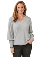 Knit Top w/ Blouson Sleeve, Shoulder Tucks And Studded Cuffs