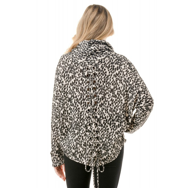 Lace Up Back Cowl Neck. 96% Polyester, 4% Spandex.