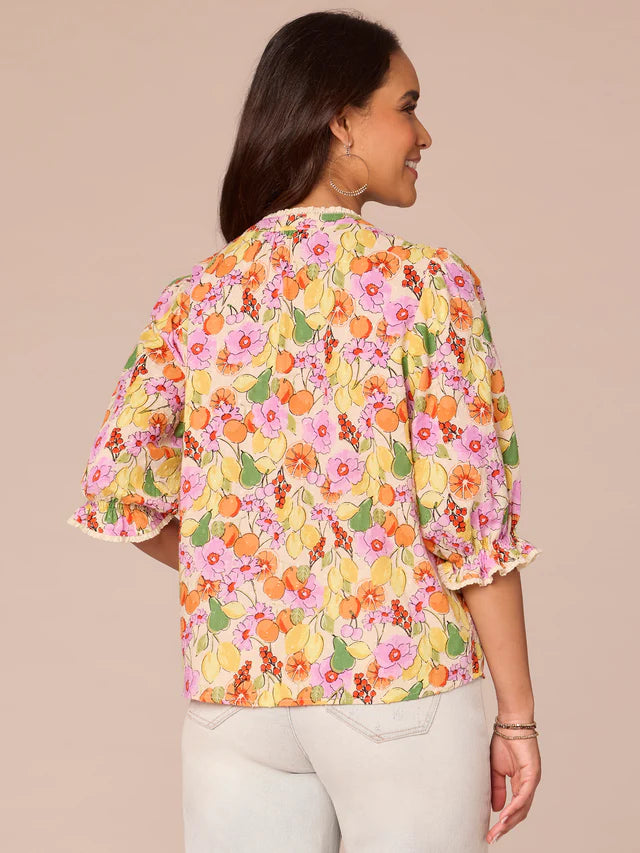 Stand Collar Half Button Placket Printed Woven Top. Pintuck Front. Elbow Lantern Banded Sleeve w/Crochet Edge. Round Shirttail Hem. 100% Cotton.