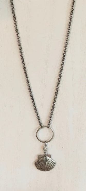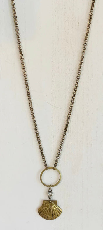 Large Clamshell on Brass Hoop w/Crystal Connector Length-36 Inches