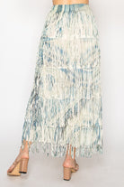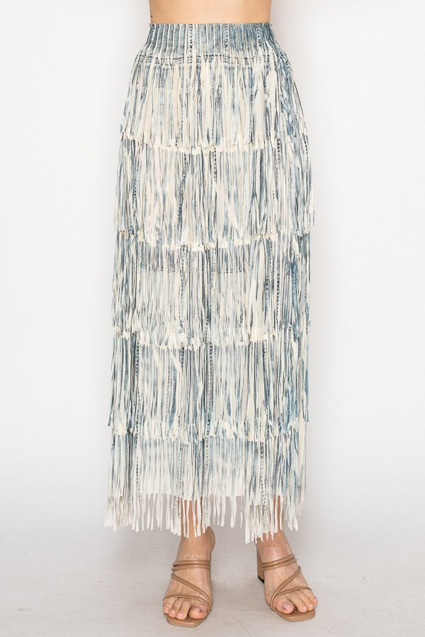 Layered Fringe Tiered Skirt. Elasticized Waistband. 100% Polyester.