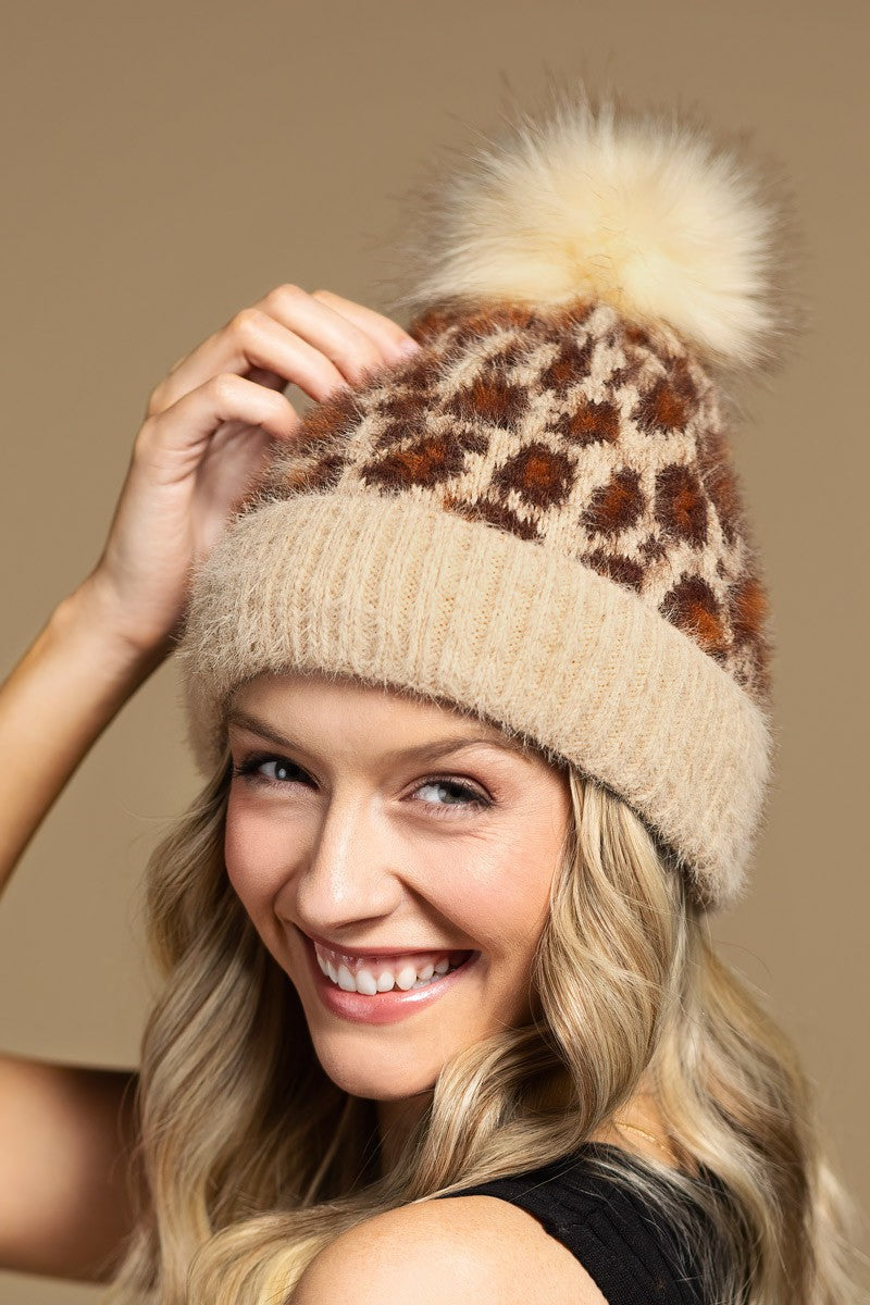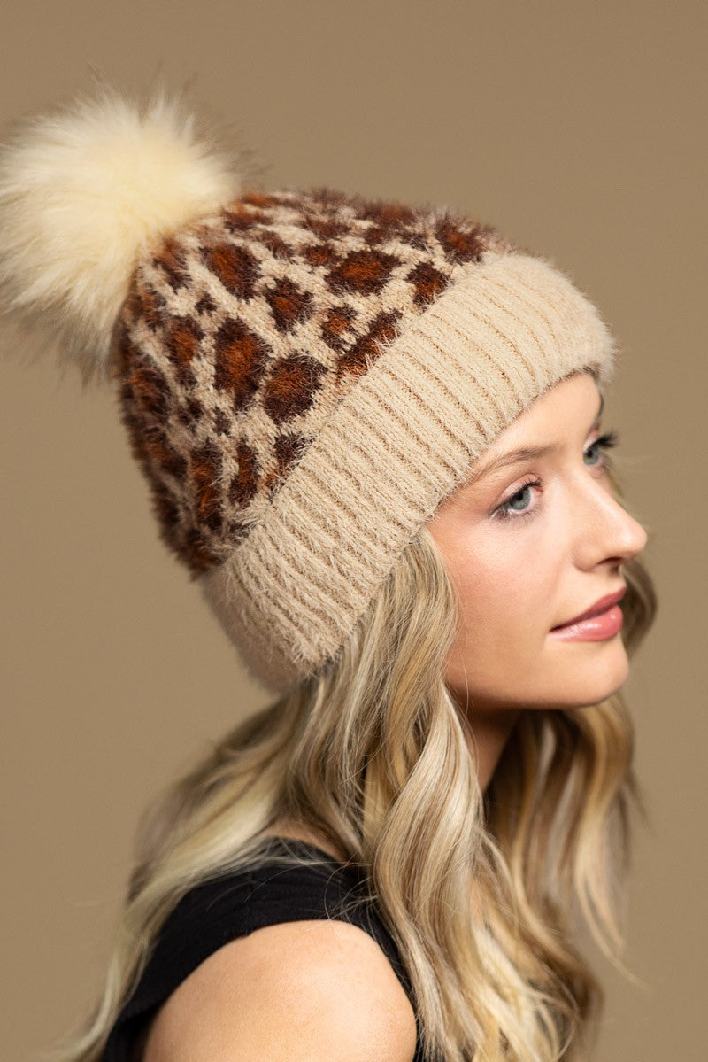 Leopard Pattern Rib Knit Beanie w/Eyelash Accent and Soft Faux PomPom. 100% Acrylic.